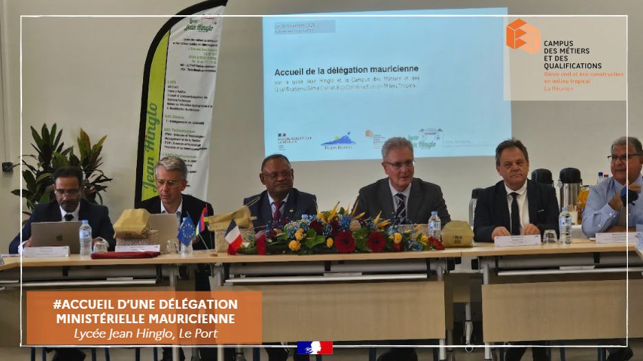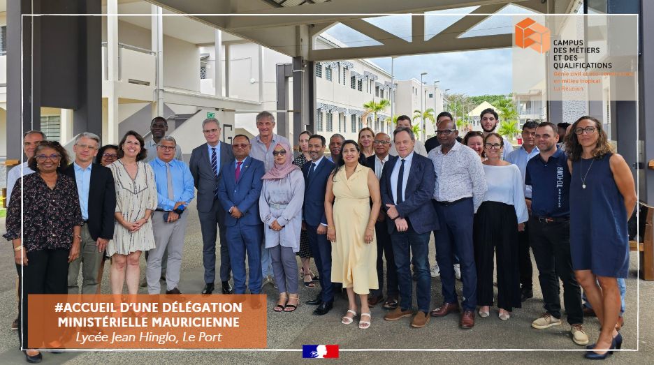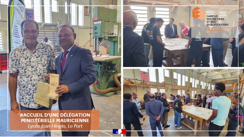 Dans le cadre de la collaboration avec l’Académie de La Réunion, la délégation ministérielle mauricienne, conduite par le ministre de l’Éducation et des Ressources humaines, est passée par le Campus des Métiers et des Qualifications Génie Civil et Éco-Construction en milieu tropical ainsi que par le lycée des métiers du BTP en milieu tropical, le lycée Jean Hinglo.