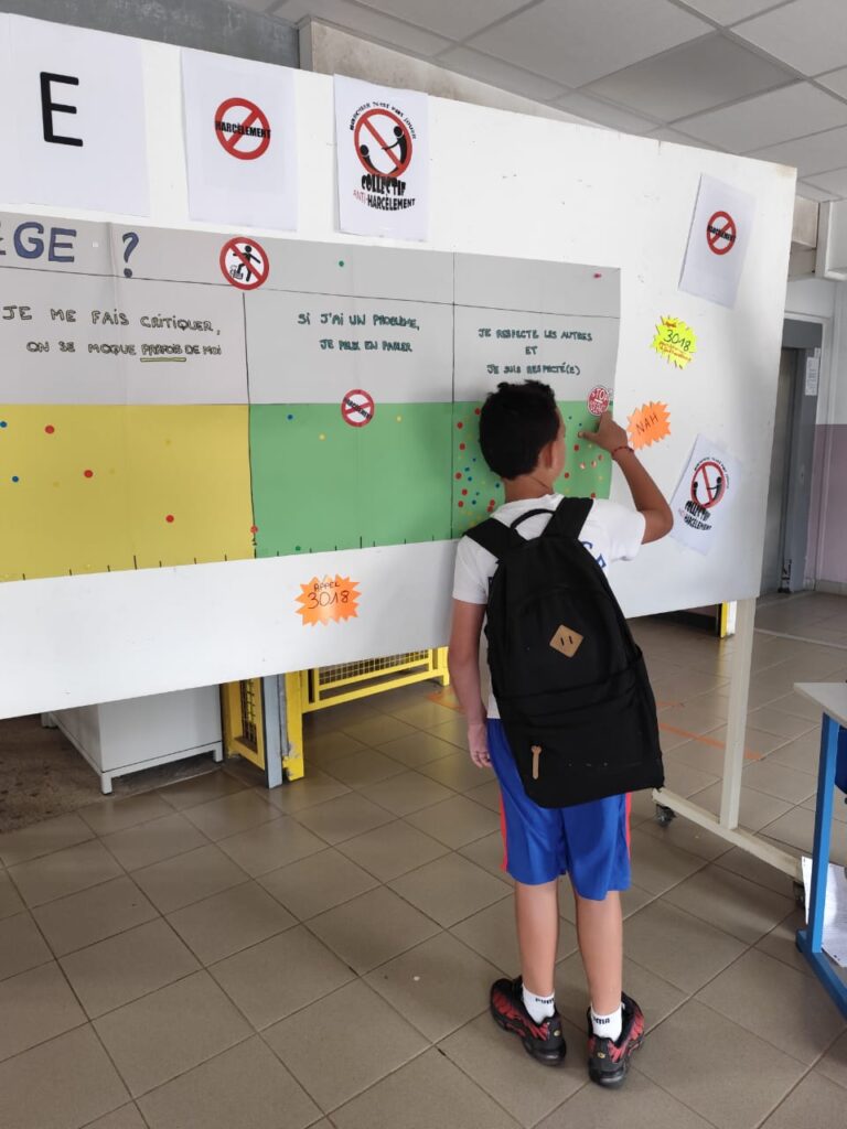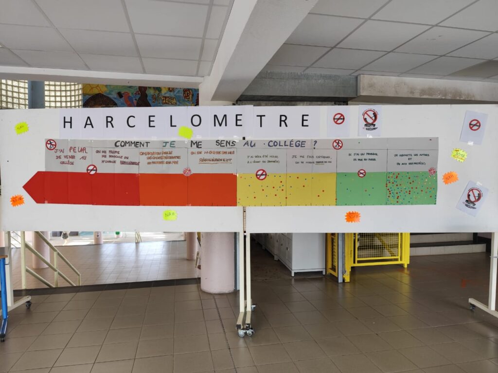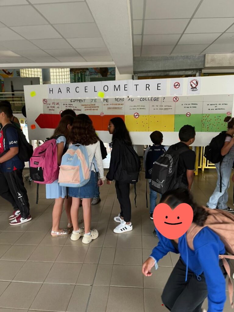 Au cœur du hall, notre « harcèlomètre », confectionné par les élèves, a permis à chacun de réfléchir et de s’exprimer sur son bien-être au collège.