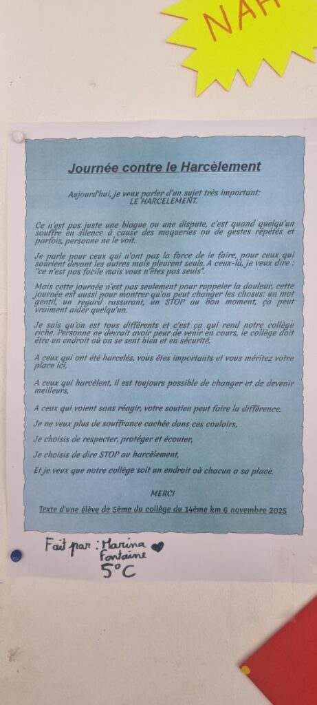 Ce jeudi 06/11/2025, le collège s’est mobilisé à l’occasion de la Journée nationale de lutte contre le harcèlement scolaire.