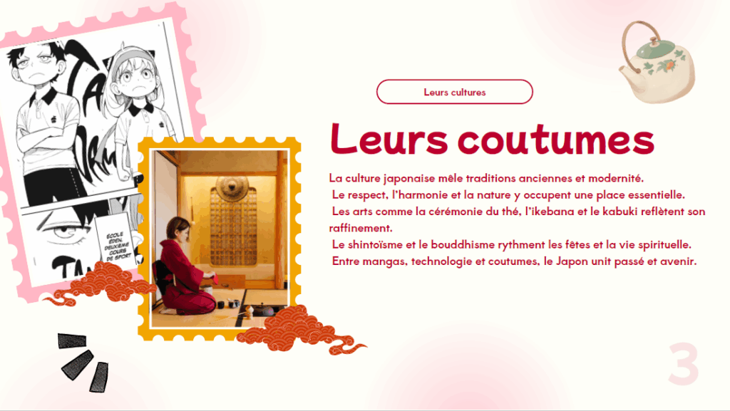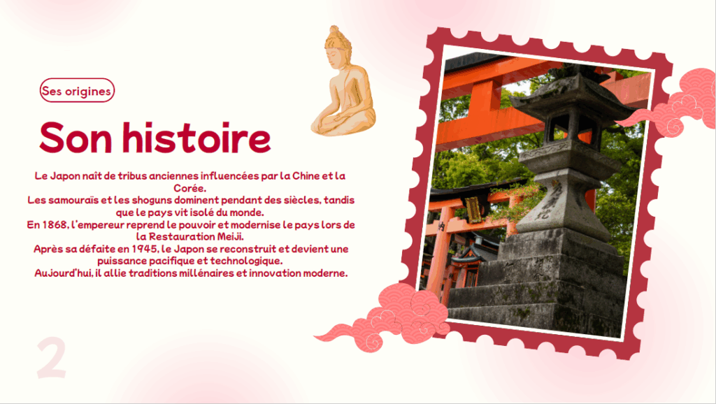 Dans le cadre de notre atelier sur le Japon, Bègue Gabriel, élève de 5e a réalisé une présentation complète à l’aide de Canva pour nous faire découvrir ce fascinant pays.