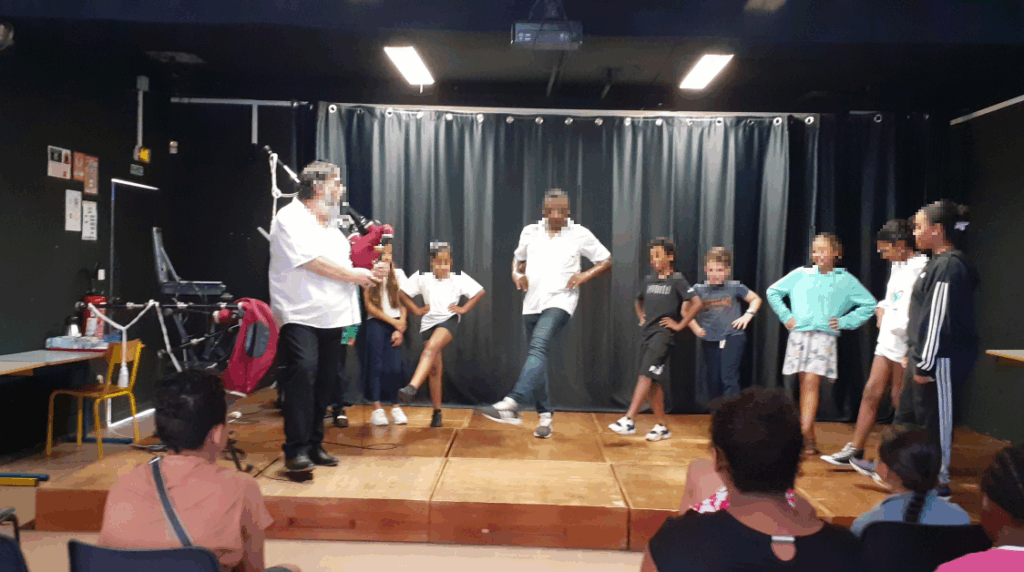 Chaque séance a été suivie d’un échange entre les artistes, les élèves et les enseignants présents sans oublier les AESH. Quelques élèves ont pu s’essayer à l’improvisation en reprenant et en interprétant les personnages principaux du conte. Ils ont également découvert un instrument symbolisant les pays celtes: la cornemuse.
