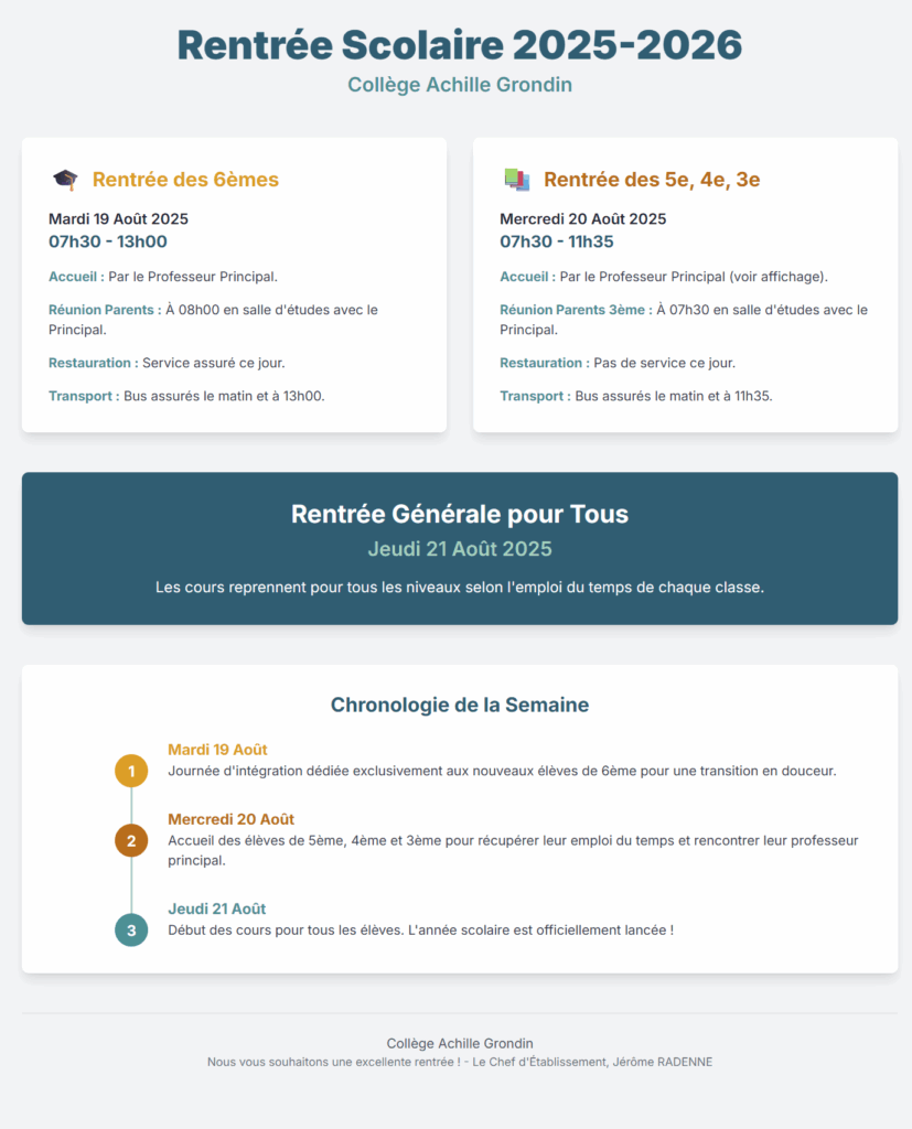 Chers parents, veuillez trouver ci-dessous l’organisation de la rentrée des élèves du lundi 19 et mardi 20 août 2024.