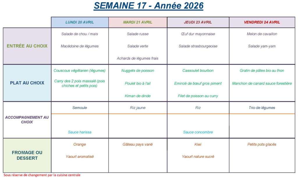 Menu restauration semaine 17