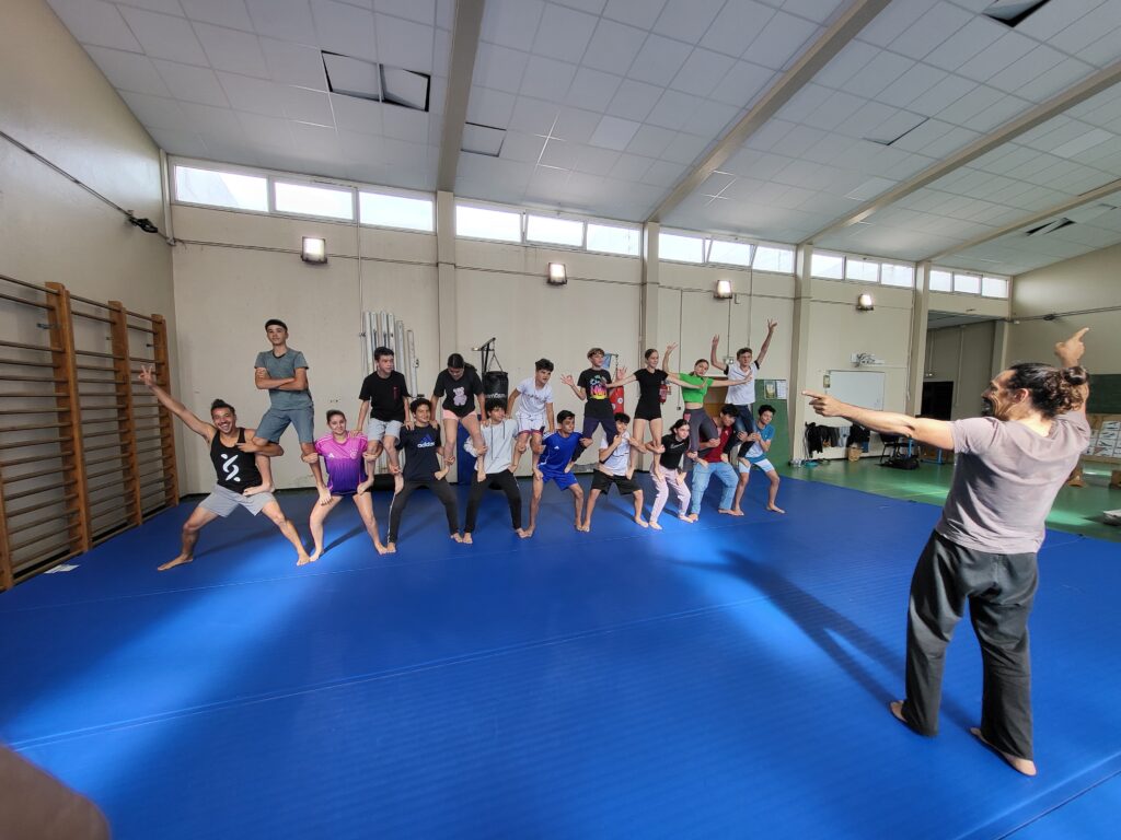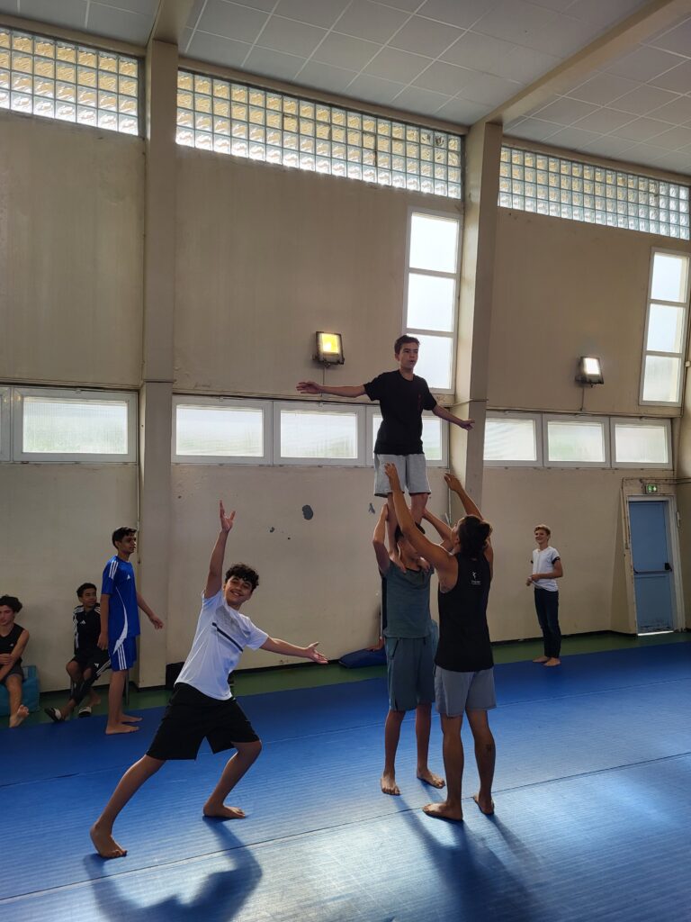 Un stage de cirque a Ă©galement Ă©tĂ© proposĂ© en soirĂ©e au sein du Mandrill Dojo, club de karatĂ© et karatĂ© mix conventionnĂ© avec le collège pour la Section RAID. Ce moment, ouvert aux adhĂ©rents volontaires – Ă©lèves, parents d’Ă©lèves et d’adultes –, a permis de faire le lien entre les pratiques sportives et artistiques, dans une ambiance conviviale et dynamique.