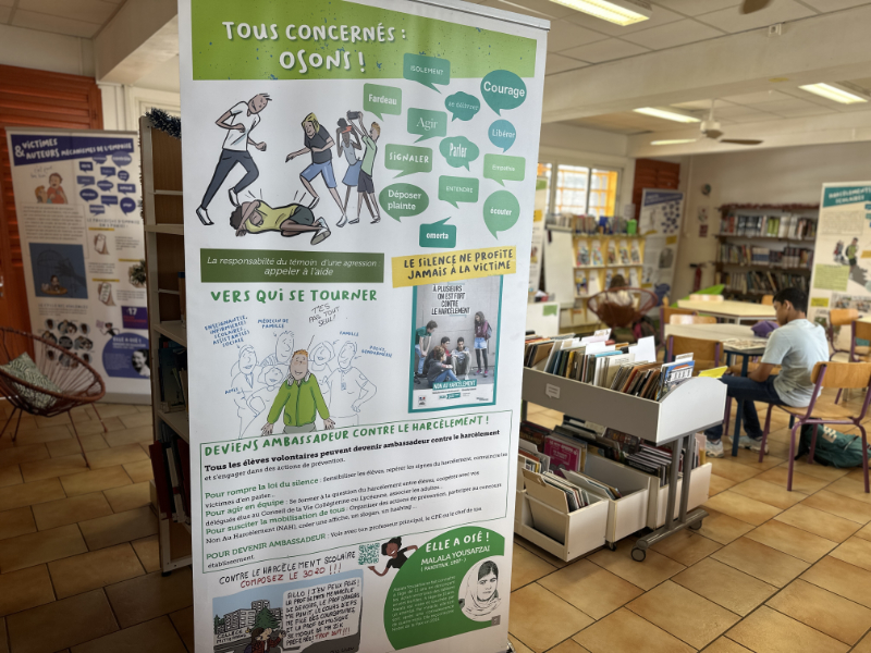 Plusieurs actions autour de la lutte contre le harcèlement ont été mises en place dans le collège comme notamment l’exposition « Violences et Harcèlement » de la MGEN au CDI et en salle d’études, à cheval sur le mois de lutte contre le harcèlement et de celui de la laïcité ; une occasion de favoriser le savoir-vivre ensemble, le respect de l’autre et le bien-être à l’école.