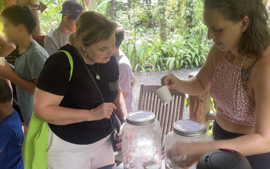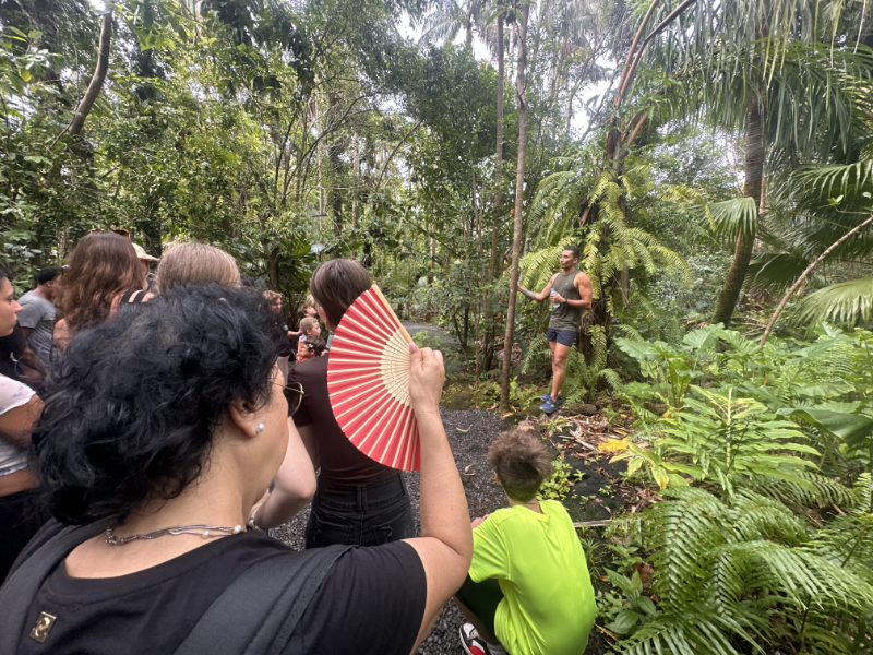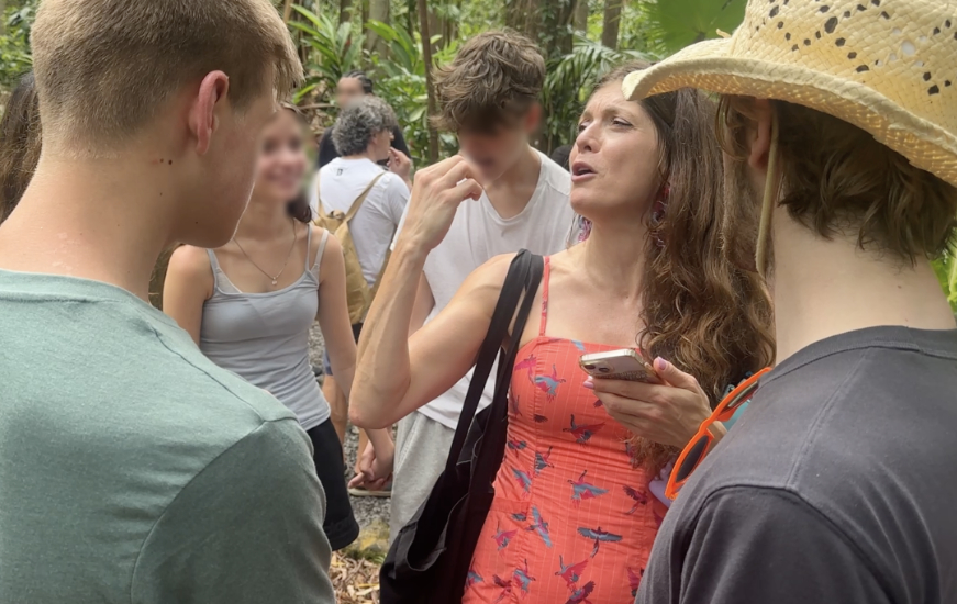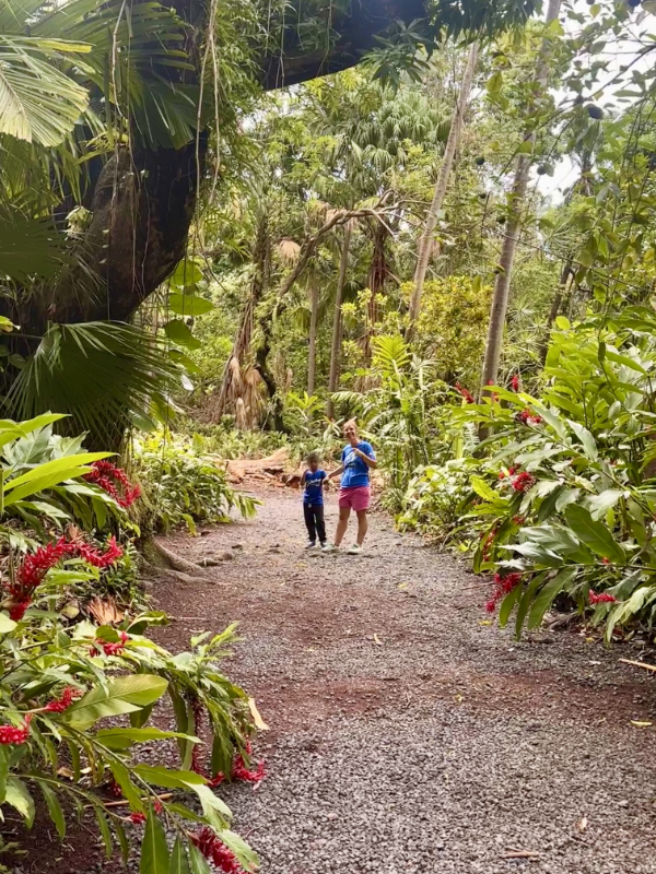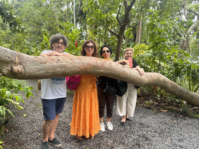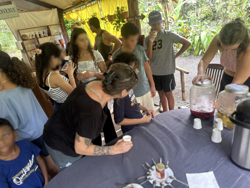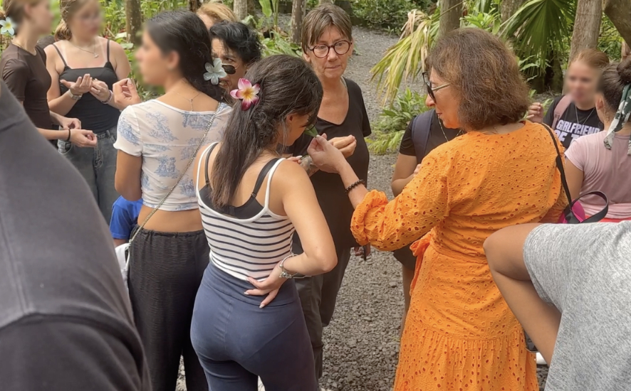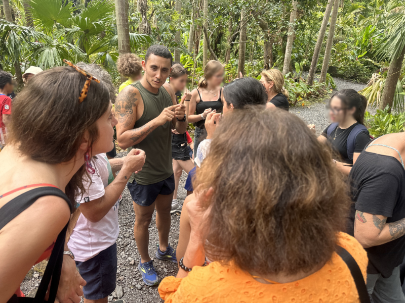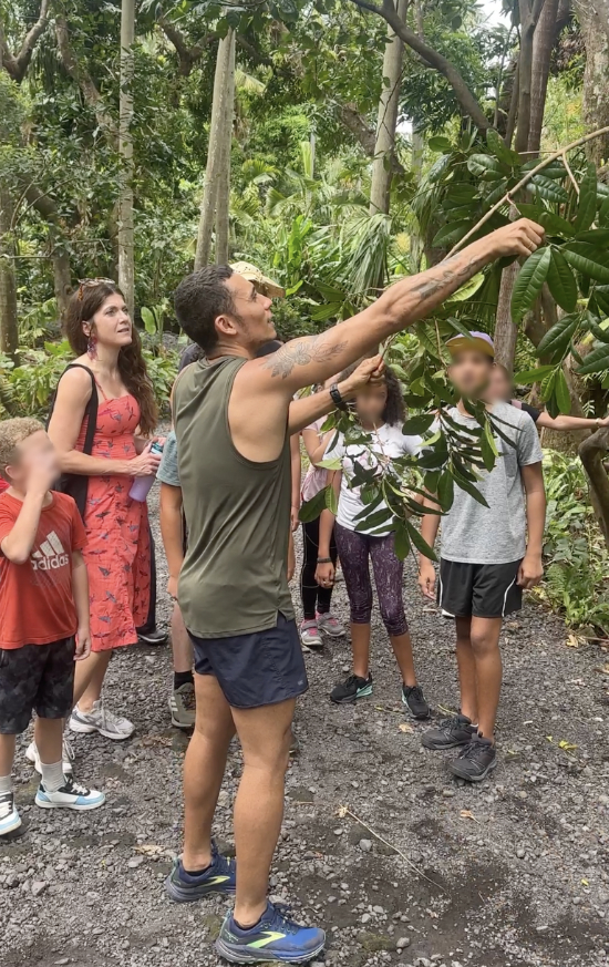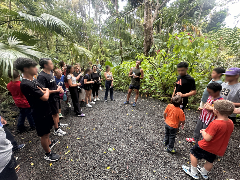 Les élèves des ULIS du collège et de l’école de Basse Vallée font l’école de forêt régulièrement. Nous avons profité de la venue des Italiens et Allemands pour les inclure au projet. Ainsi, les élèves, en liaison inter-degrés, ont fait une visite du Jardin des Parfums et des Épices de St-Philippe. En plus des explications riches de notre guide Matthieu, tout le monde a pu sentir différentes épices et ont dégusté des infusions et du miel artisanal. Cette matinée s’est clôturée par un pique-nique à Cap Méchant, avant que le groupe ne soit rattrapé par la pluie.