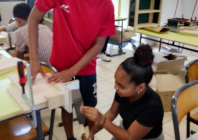 Ils ont également pu visiter l’atelier de Mme Bonhomme et utiliser différents outils tels que la scie à chantourner et découvrir des essences de bois de la Réunion comme le bois de tamarin et le bois de camphrier.