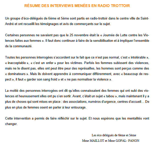 Par ailleurs, les éco-délégués ont réalisé un radio-trottoir dans la ville de Saint-André avec Mme Maillot et Mme Gopal-Panon, en allant à la rencontre des habitants pour recueillir leurs ressentis et leurs points de vue sur cette journée de mobilisation.