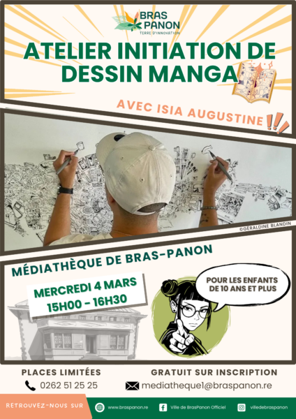 La médiathèque de Bras-Panon organise un atelier créatif autour du dessin manga le mercredi 4 mars, de 15h00 à 16h30.