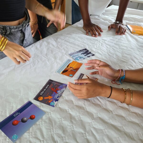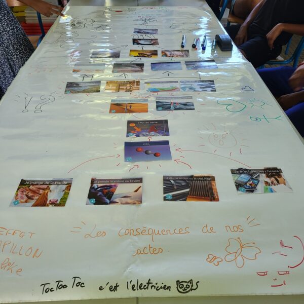 Cent élèves des classes de 303, 305, 306 et 308 viennent d’être formés en SVT aux causes et conséquences du réchauffement climatique lors de l’atelier de la « Fresque du climat », tout comme deux millions de personnes à travers le monde. Madame Julie COCHART animait cet atelier au Collège Fanny Desjardins en proposant des jeux de cartes issues des données scientifiques actuelles. Les élèves avaient pour mission de construire cette fresque dans un premier temps puis de débattre de solutions pour que chacun, à son échelle, puisse agir en limitant son impact sur la planète. Quelques titres de leurs réalisations soulignent leur compréhension et leur engagement :