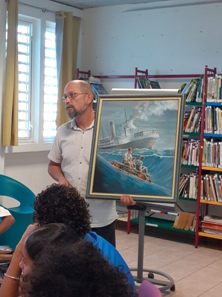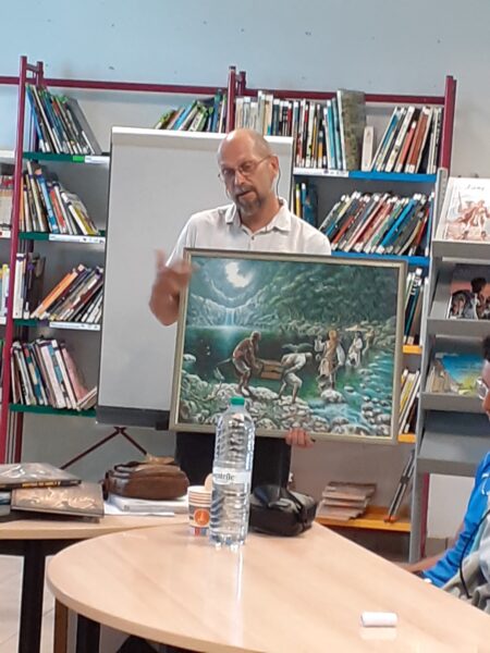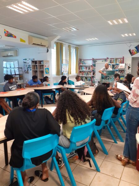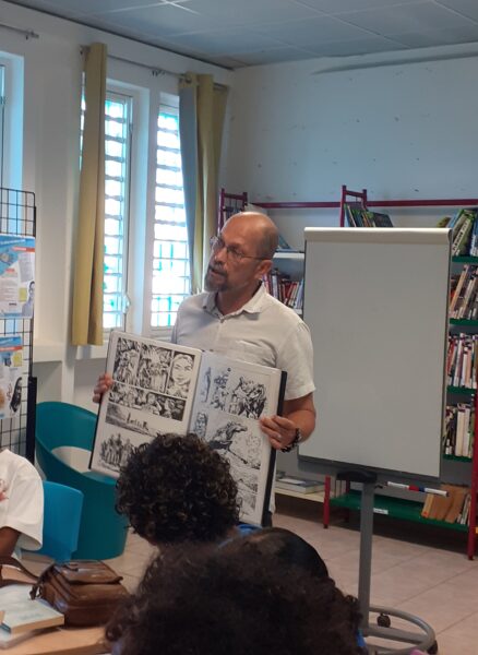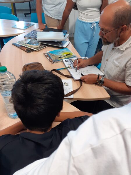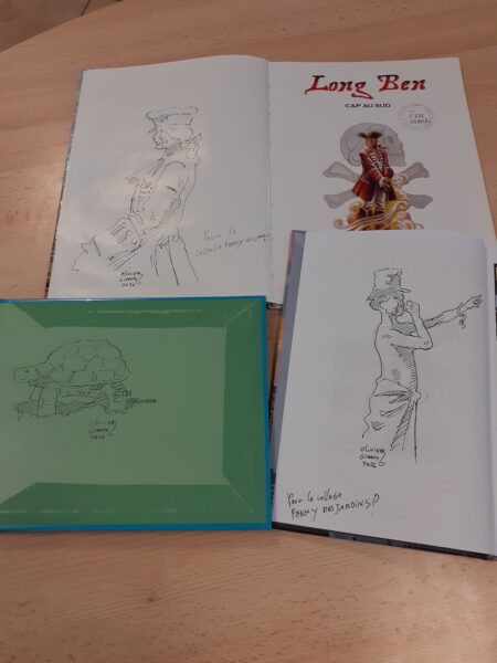C’était la deuxième et dernière étape du dispositif Jeunes en librairie, dont l’un des objectifs est la rencontre avec les acteurs de la chaîne du livre. Pendant 1 heure chaque classe a pu échanger avec le dessinateur /illustrateur et l’interroger sur son parcours et ses œuvres dont les bandes dessinées Long Ben (tomes 1 & 2) lues par les élèves. L’auteur qui est venu avec ses books et d’autres productions leur a aussi expliqué ses techniques de création ( crayon, peinture, tablette graphique) et sa collaboration avec les autres professionnels du livre (romanciers, scénaristes, éditeurs). Olivier Giraud n’a pas hésité à encourager et donner de précieux conseils à certains élèves passionnés comme lui par le dessin. Une très belle rencontre qui s’est achevée sur une séance de dédicaces des livres du CDI.