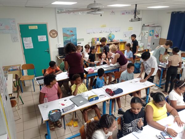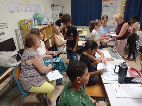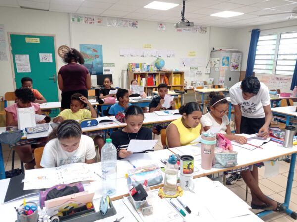 Six élèves de 4è, anciens élèves de l’école Narassiguin, sont partis sur les traces de leur enfance à la rencontre des élèves de CM2 de leur école. Ils ont représenté leurs camarades de classe en offrants aux écoliers quelques cent dépliants réalisés au total par les collégiens de 4è. Ces « flyers » visent à informer les enfants des moyens de protection de la population réunionnaise face aux risques volcaniques et à les rassurer dans ce sens.