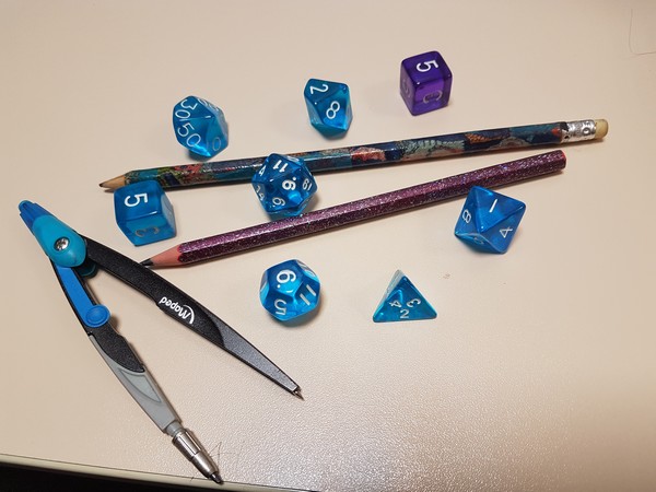 Photo matériel de Mathématiques dés de jeu, compas crayons