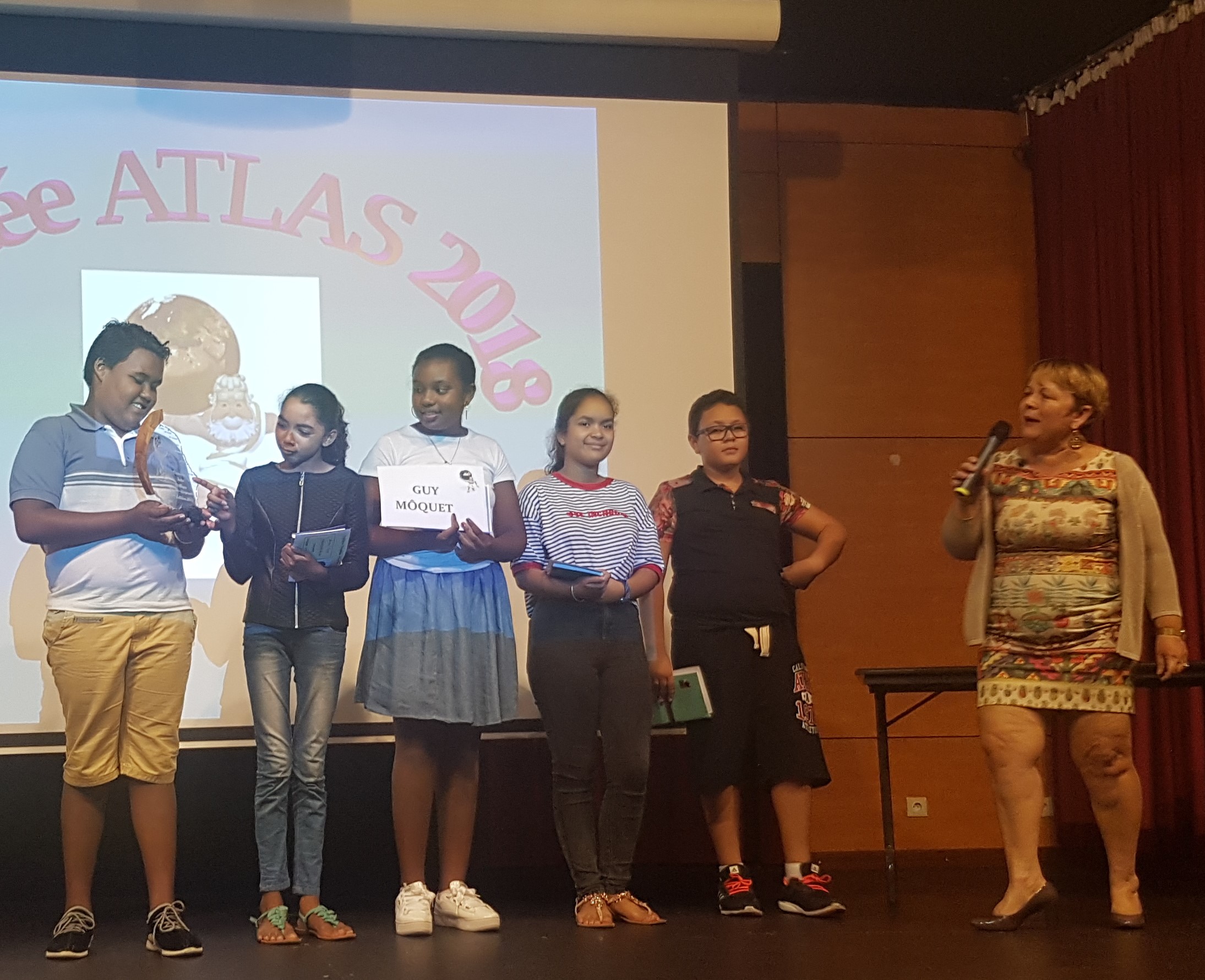 La principale du collège Hippolyte Foucque remet le trophée Atlas aux finalistes du collège vainqueur : le collège Guy Môquet.