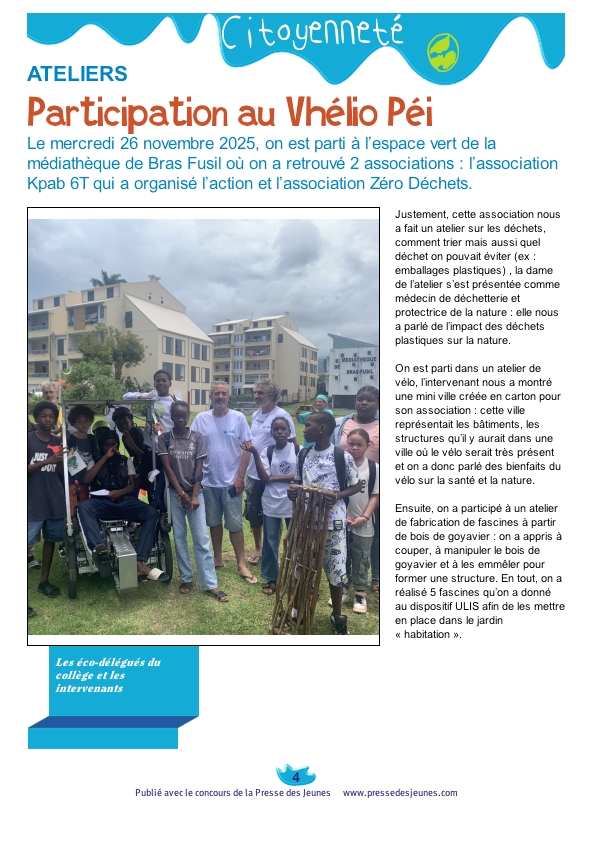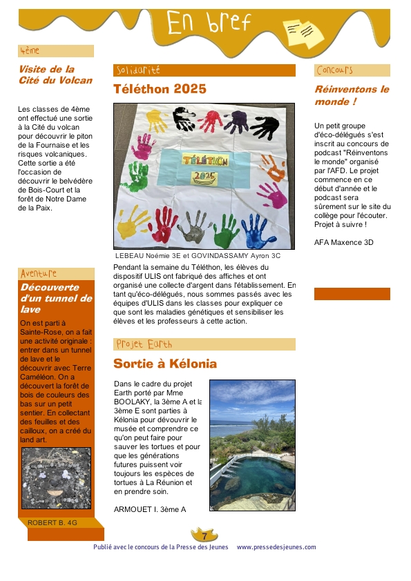 Les éco-délégués et la classe de 4ème E ont réalisé le premier journal du collège pour cette année scolaire 2025/2026. Nous vous laissons découvrir les divers articles liés aux sorties et projets menés autour du développement durable. Bonne lecture !