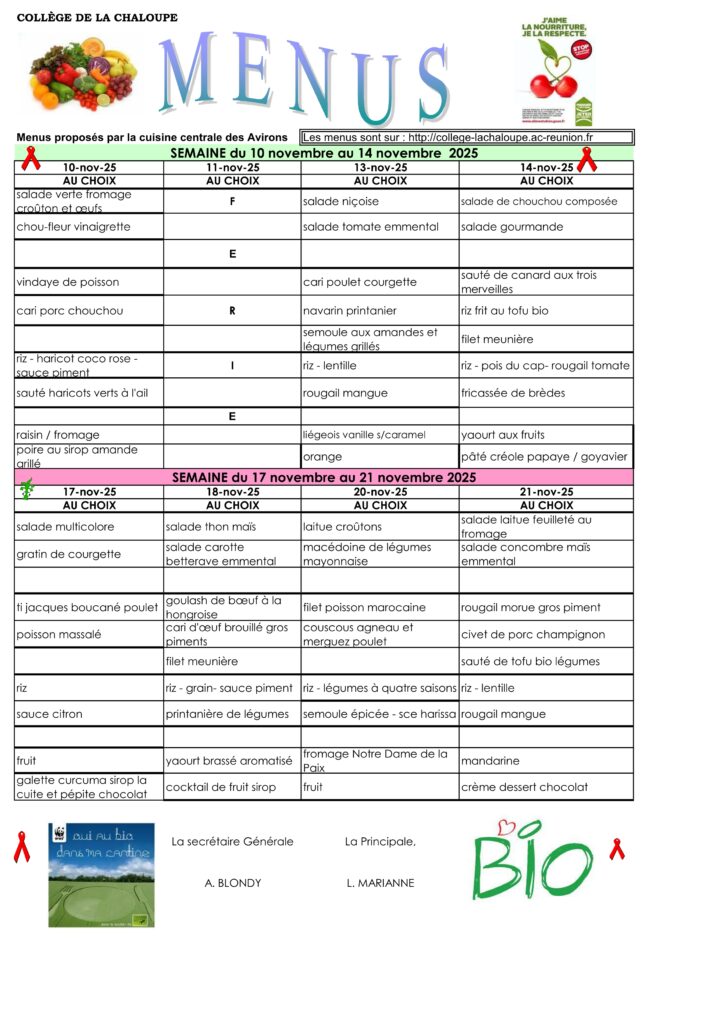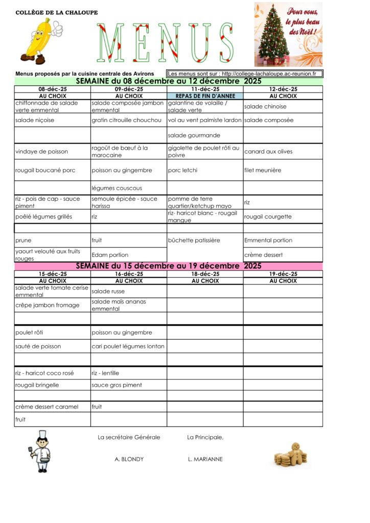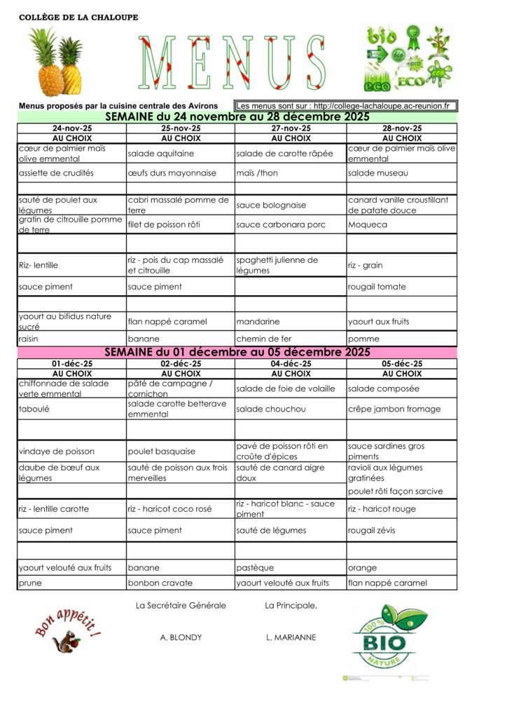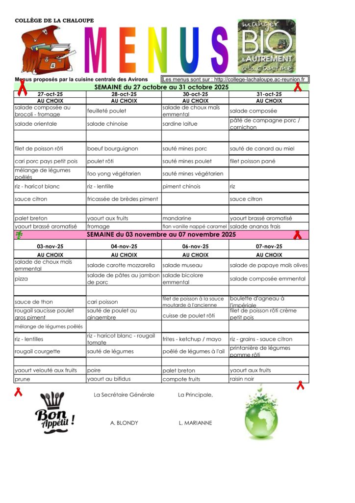 Menu de la cantine, du 27 octobre 2025 au 19 décembre 2025