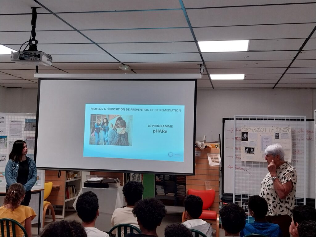 Mme Badon et M. Chartier le vendredi, puis Mme Badon et Mme Merlo le lundi sont intervenus au CDI pour animer un atelier d’une heure. A partir d’un diaporama et d’exemples tirés de l’actualité locale, des échanges se sont engagés entre les 6èmes et les intervenants. Les élèves ont pu aussi poser des questions suite aux interventions de Mme Hoarau (CPE) en lien avec des exemples concrets rencontrés au collège ou dans la classe. Enfin, une  ambassadrice (dans le cadre du programme pHARe) en 4ème est venue -en dehors de ses cours- présenter son rôle devant plusieurs classes.