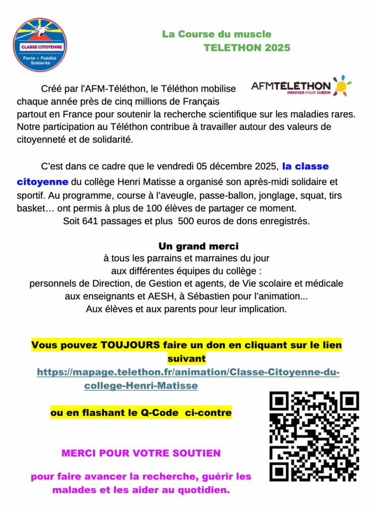 C’est dans le cadre du Téléthon 2025 que la classe citoyenne du collège Henri Matisse a organisé son après-midi solidaire et sportif, le vendredi 05 décembre 2025. Cette participation contribue à travailler autour des valeurs de citoyenneté, de solidarité, de fierté et de fiabilité.
