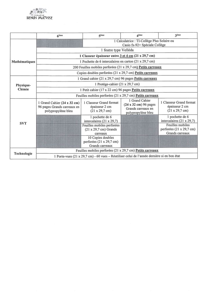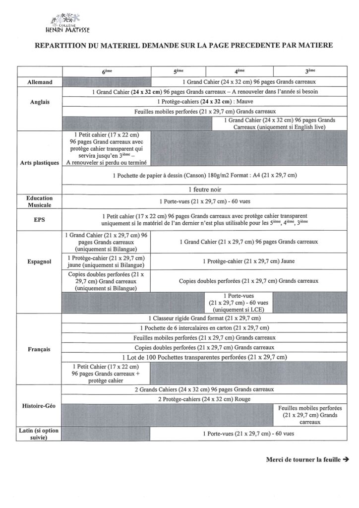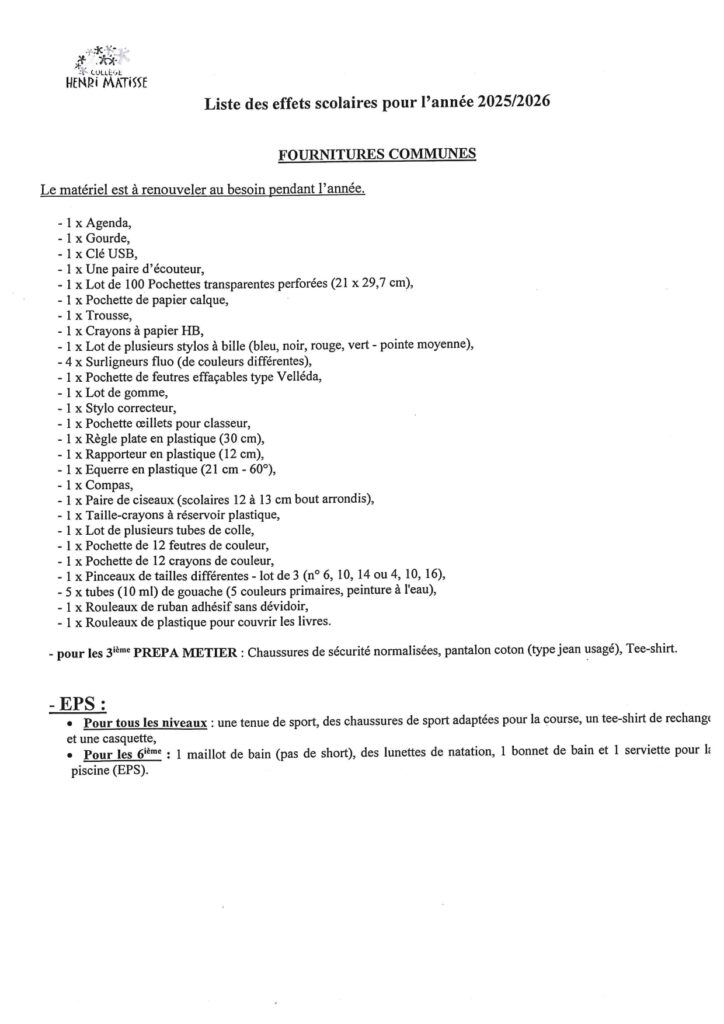 Chers parents, Vous trouverez ci-dessous la liste des effets scolaires pour la prochaine rentrée. Cordialement,