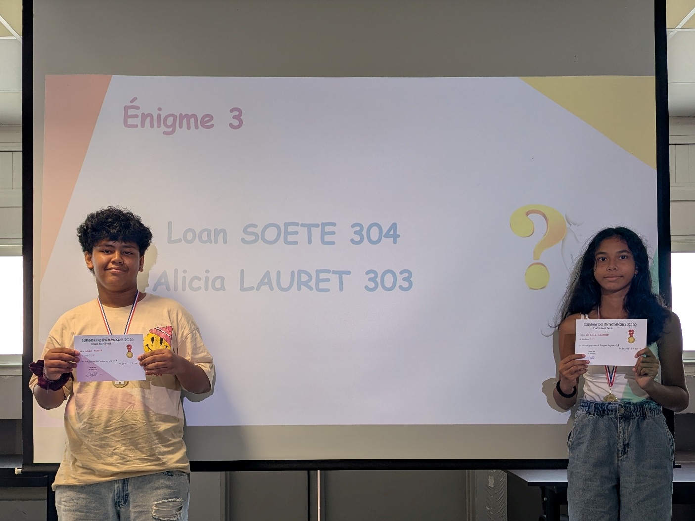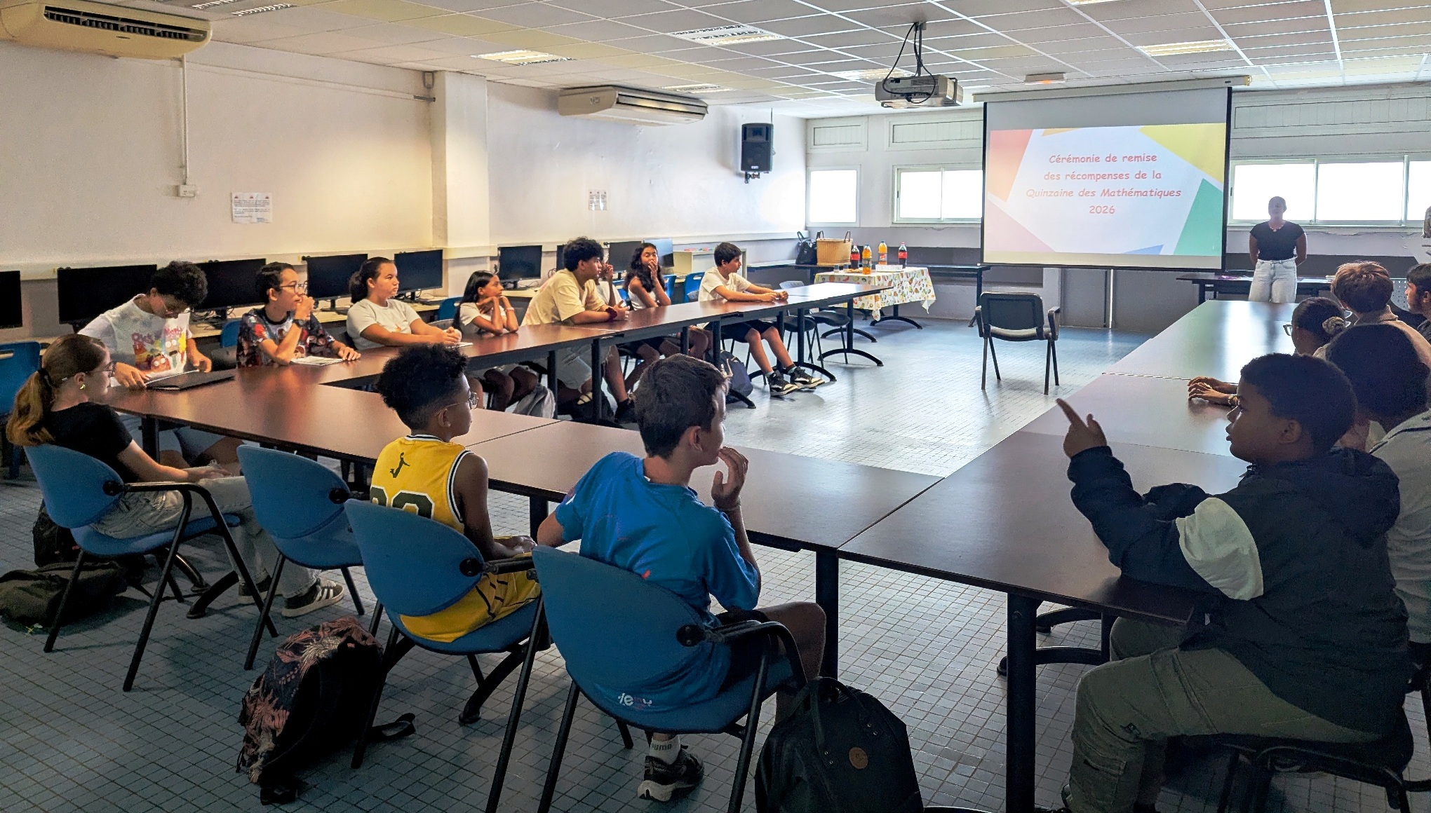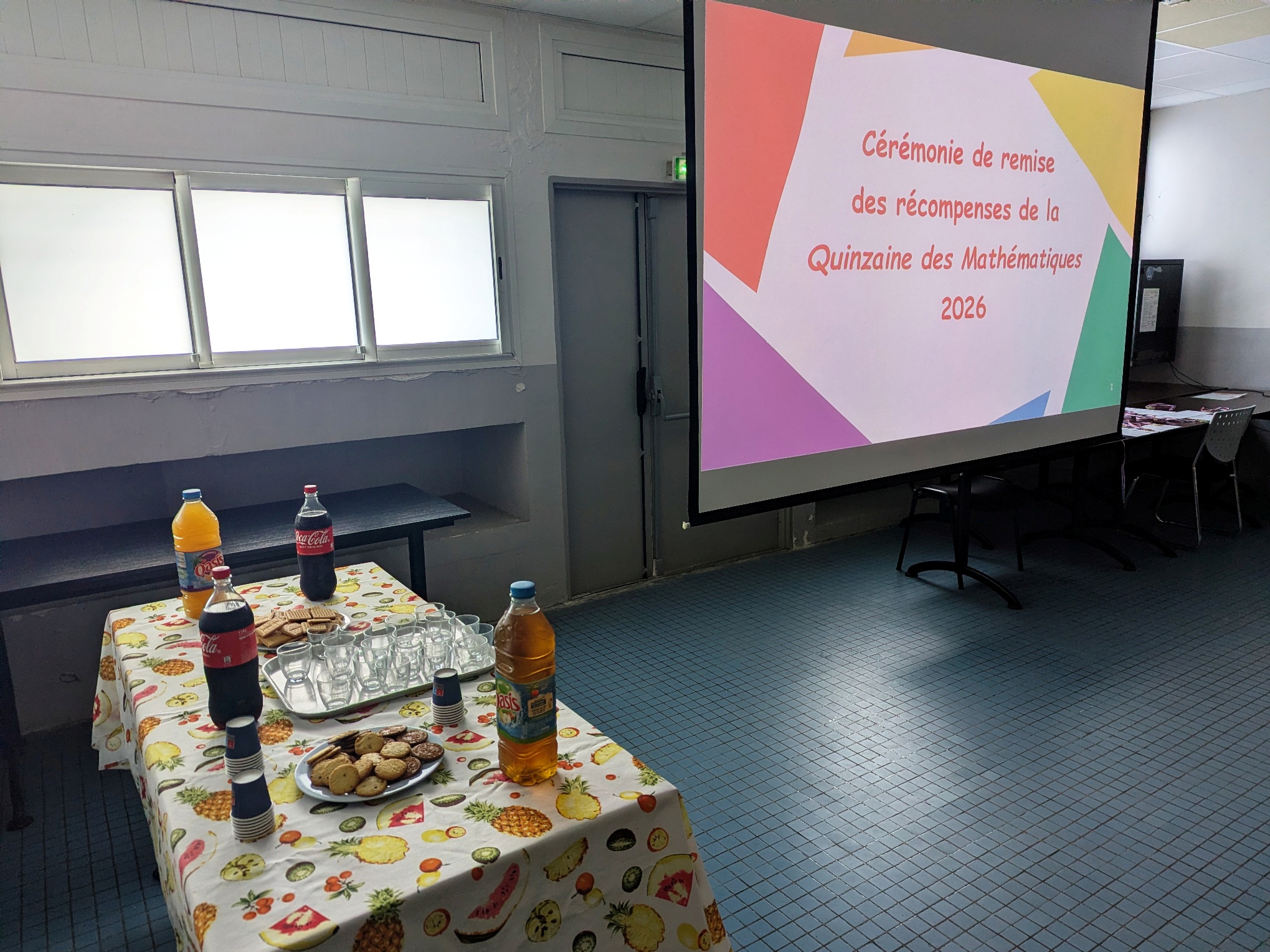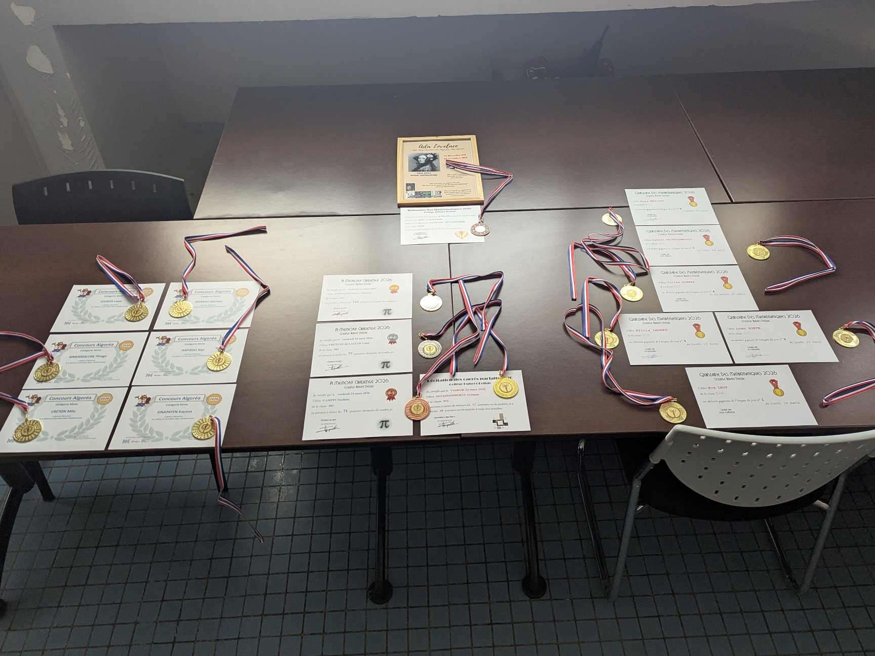 La Quinzaine des Mathématiques 2026 s'est clôturée par une cérémonie de remise de récompenses au cours de laquelle tous les élèves qui se sont distingués au travers d'actions et de concours ont été primés : vainqueurs du concours Algoréa, des concours de mémoire mathématique, gagnants des énigmes de la Quinzaine, gagnante du prix du poster préféré de l'exposition "Les MathéMaticien(ne)s à travers les siècles".