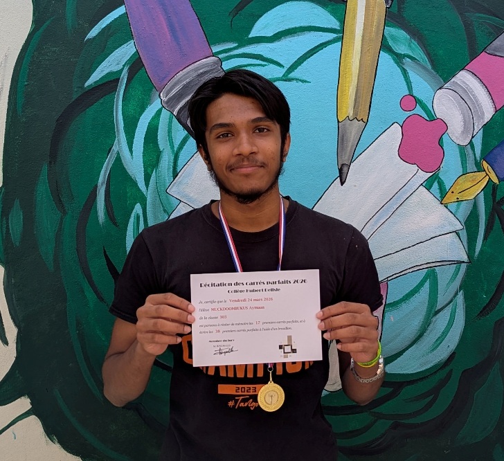 Posté par Ringwald Julien le 30 Mar 2026 dans Les concours Concours de récitation des carrés parfaits 2026 Toutes nos félicitations à Aymaan qui inaugure ce nouveau concours de "mémoire mathématique".Pour cette première édition, il repart avec la médaille d'or pour 17 carrés parfaits récités de mémoire, et 38 avec l'appui d'un brouillon ! Bravo !