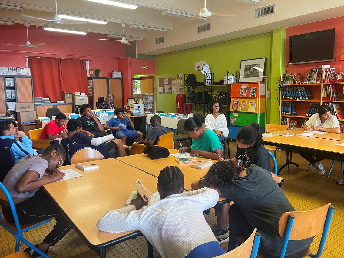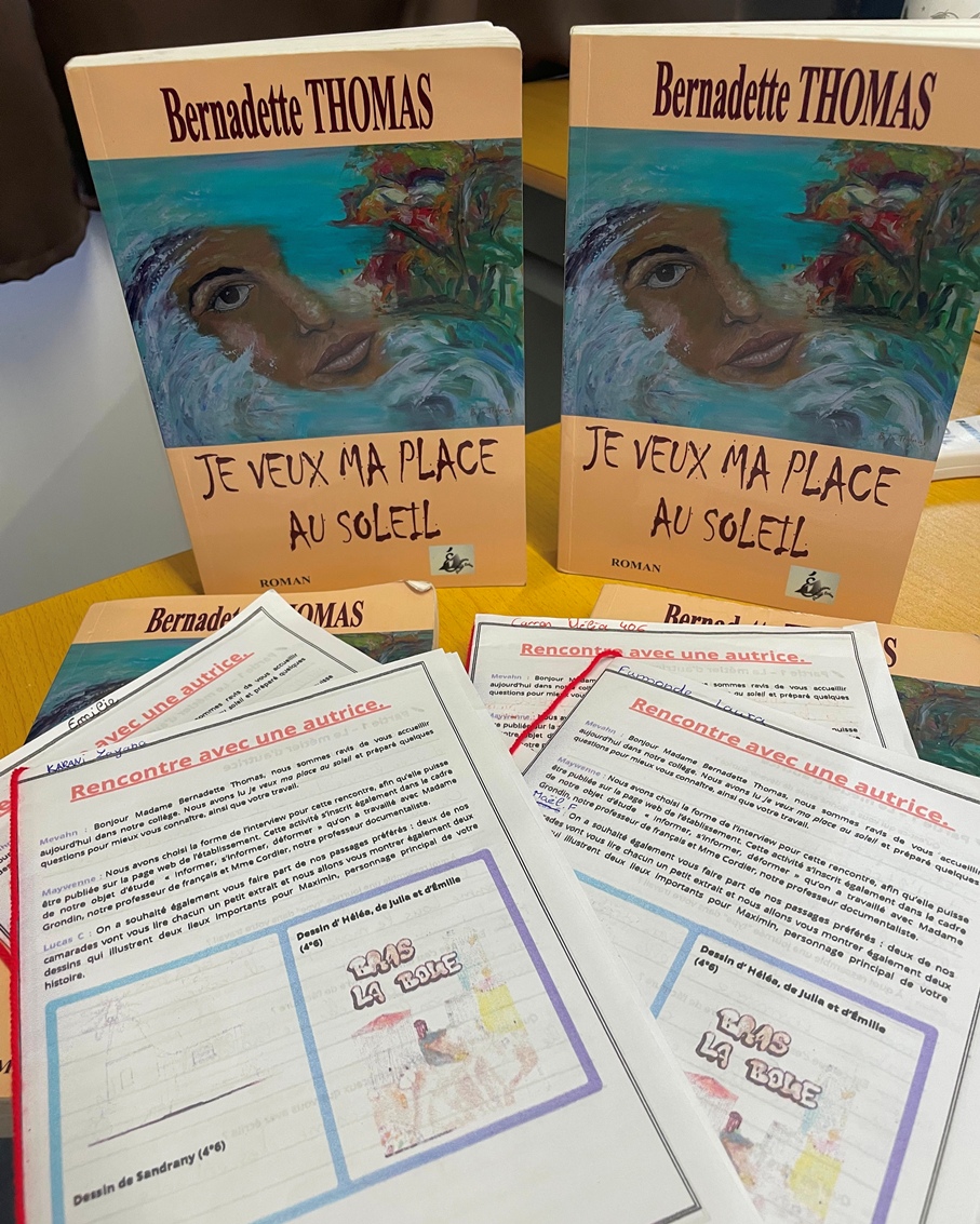 Le jeudi 12 juin 2025, la classe de 406 a accueilli Madame Bernadette Thomas, autrice qui a écrit Je veux ma place au soleil. Roman que nous avons lu et étudié avec Madame Grondin, en lien avec l’objet d’étude « Informer, S’informer, Déformer », travaillé également avec Madame Cordier.