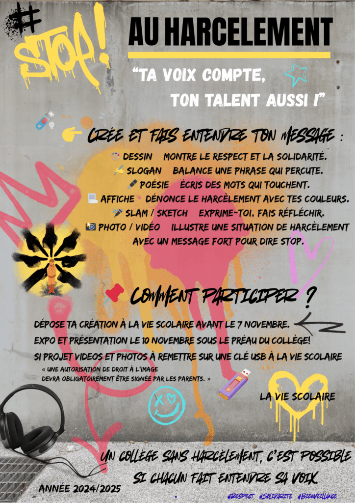 📃 Une affiche – dénonce le harcèlement et encourage le respect.