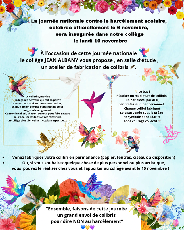 Pour valoriser la journée nationale de la lutte contre le harcèlement scolaire, nous proposons un événement autour de la fabrication de colibris.