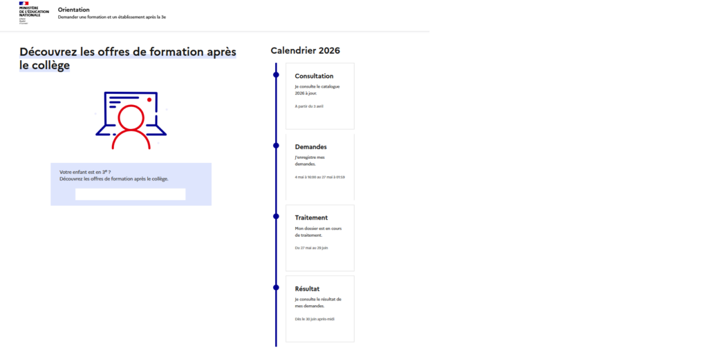 Nous vous rappelons que l’ouverture de la consultation de l’offre de formation post 3e sera effective ce vendredi 03 avril 2026 à 16h.