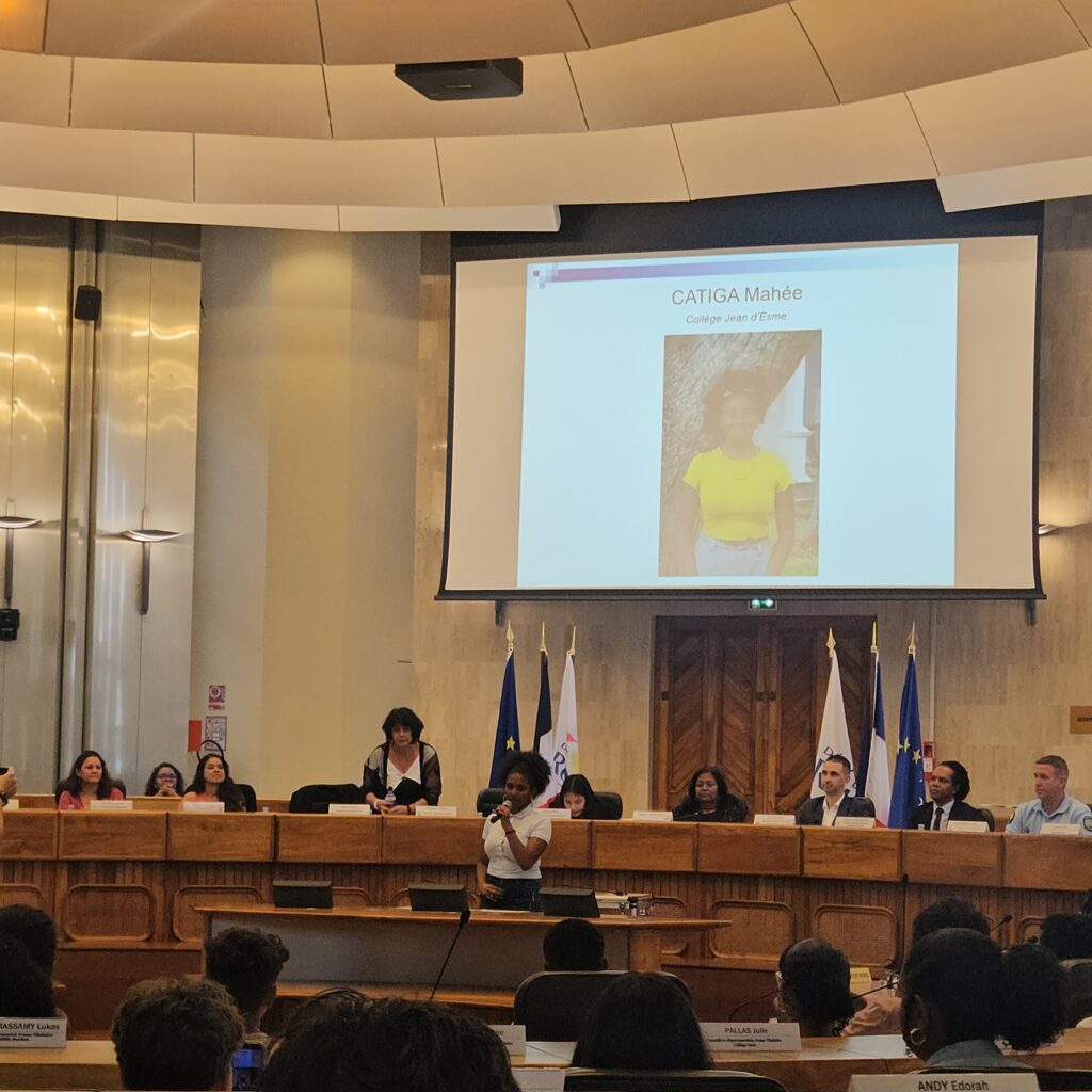 Ce vendredi 14 novembre 2025, les 3 élèves membres du Conseil Départemental Jeunes (5ème, 4ème, 3ème) ont été conviés à l’hémicycle de Saint-Denis pour participer aux élections à la présidence. Parmi eux, Mahée, élève très investie, a représenté avec fierté notre collège en présentant officiellement sa candidature.