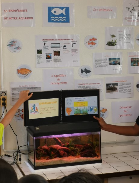 Ainsi, « le club aquariophilie » a été créer et cette atelier s’est déroulé pendant la pause méridienne de septembre à avril. Les élèves ont eu la chance de mettre en pratique et de développer diverses compétences dans le domaine, que ce soit en mathématiques, en français ou en sciences. Ils ont alors appris à demander un devis, faire des recherches pour créer leur aquarium, installer l’aquarium, communiquer les résultats de recherches dans un album et réaliser un panneau mural pour leur exposition orale à destination des élèves du collège