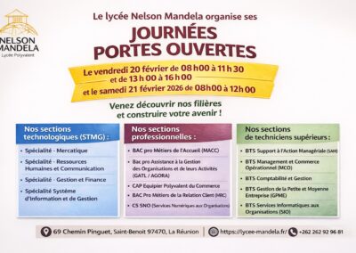 Samedi 21 février: lycées M. Gandhi, J. Perrin, N. Mandela, G. Ethève ( anciennement Stella), C. Antou ( lycée hôtelier), et MFR de Saint-André.