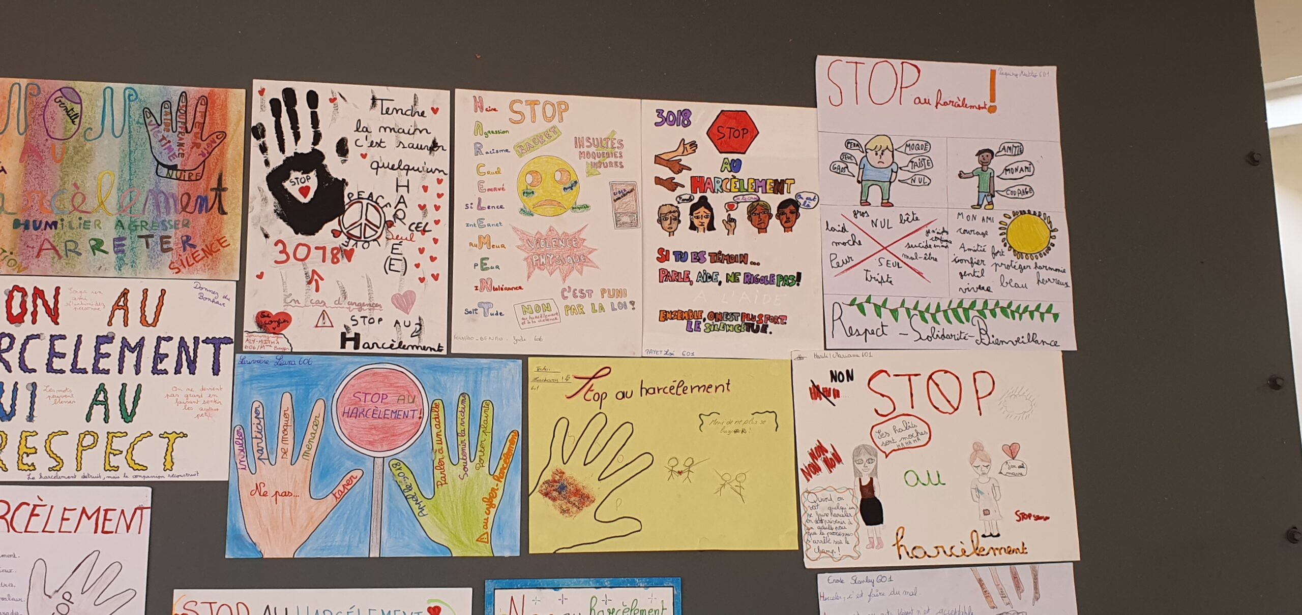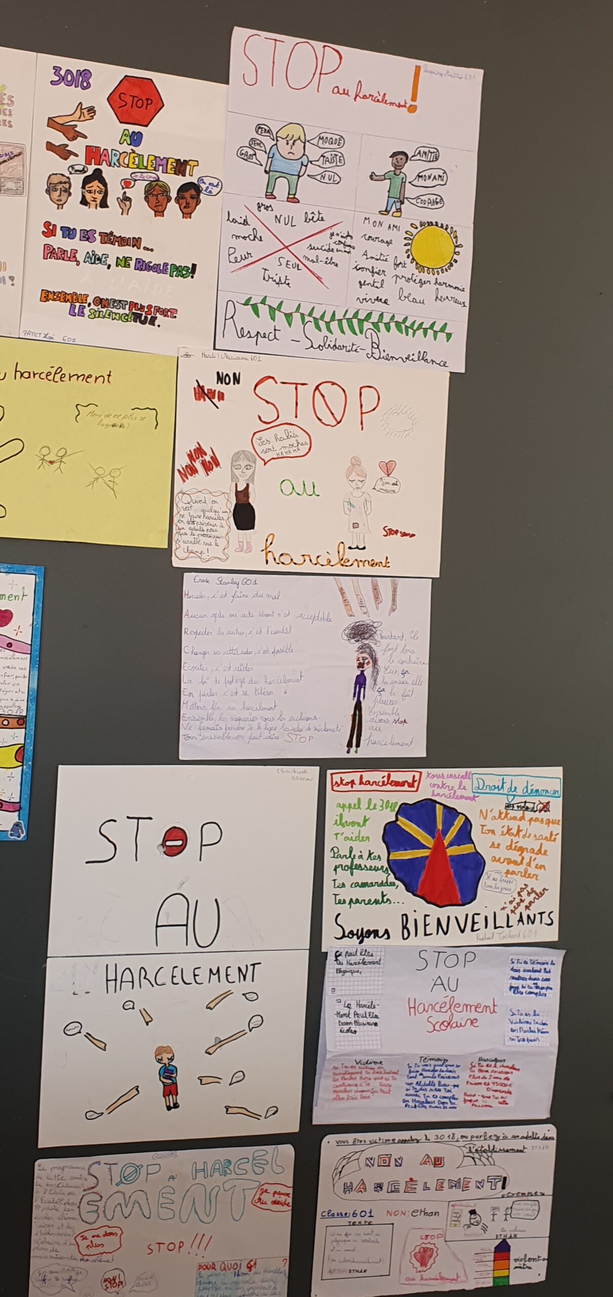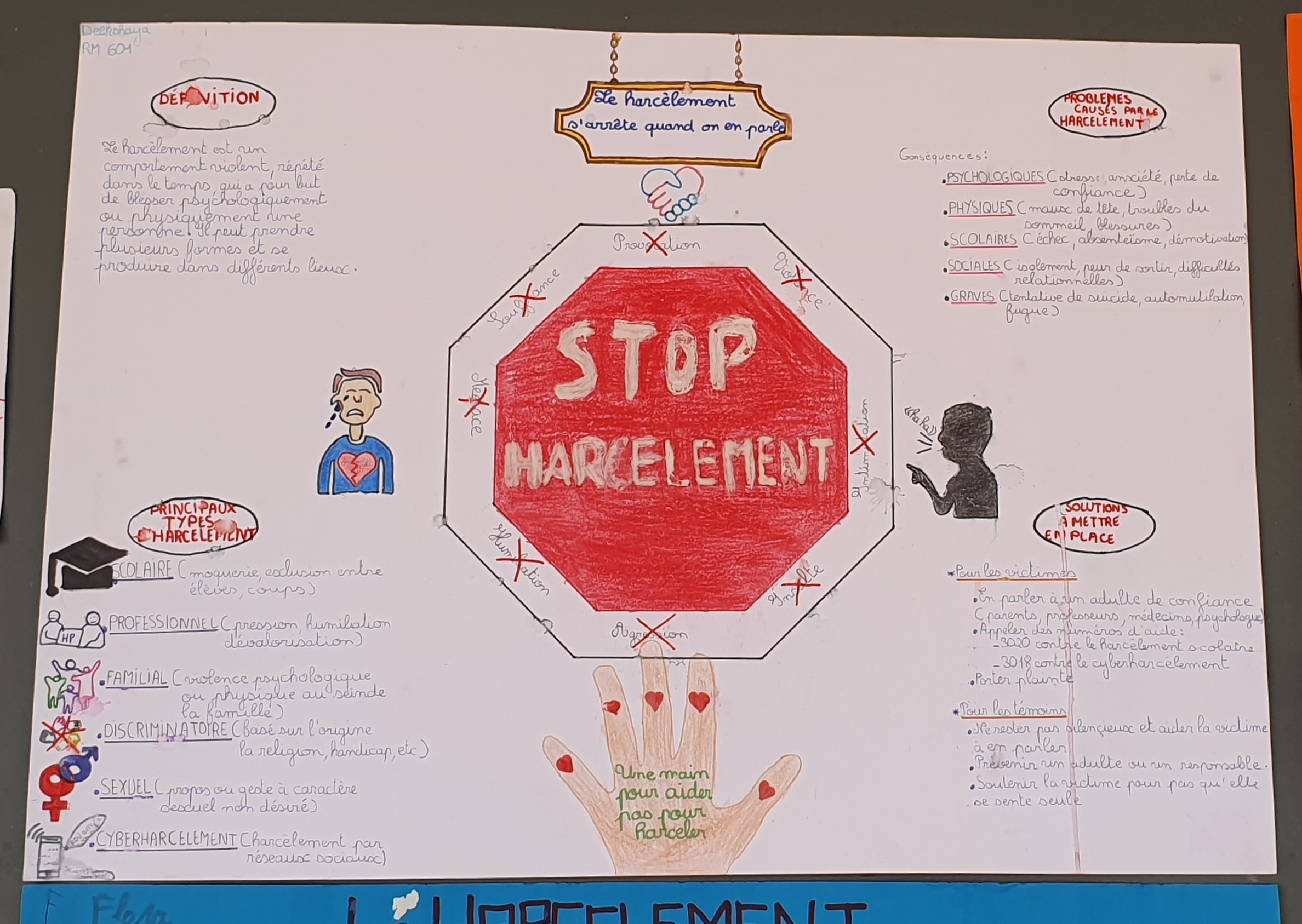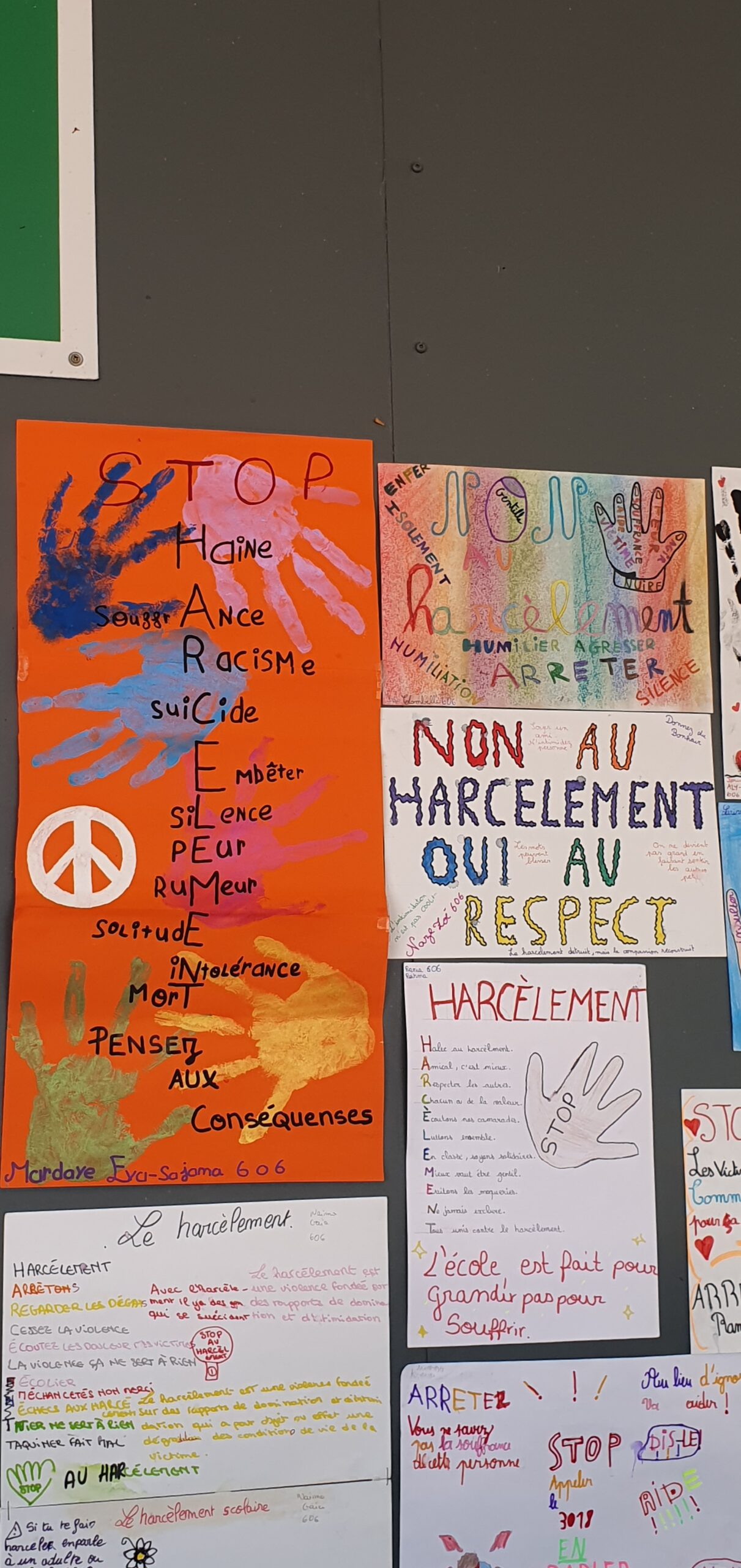 – De même, les élèves de 601 et 606 ont réalisé des affiches pour dire « stop au harcèlement ! ». Elles sont exposées à côté du réfectoire.