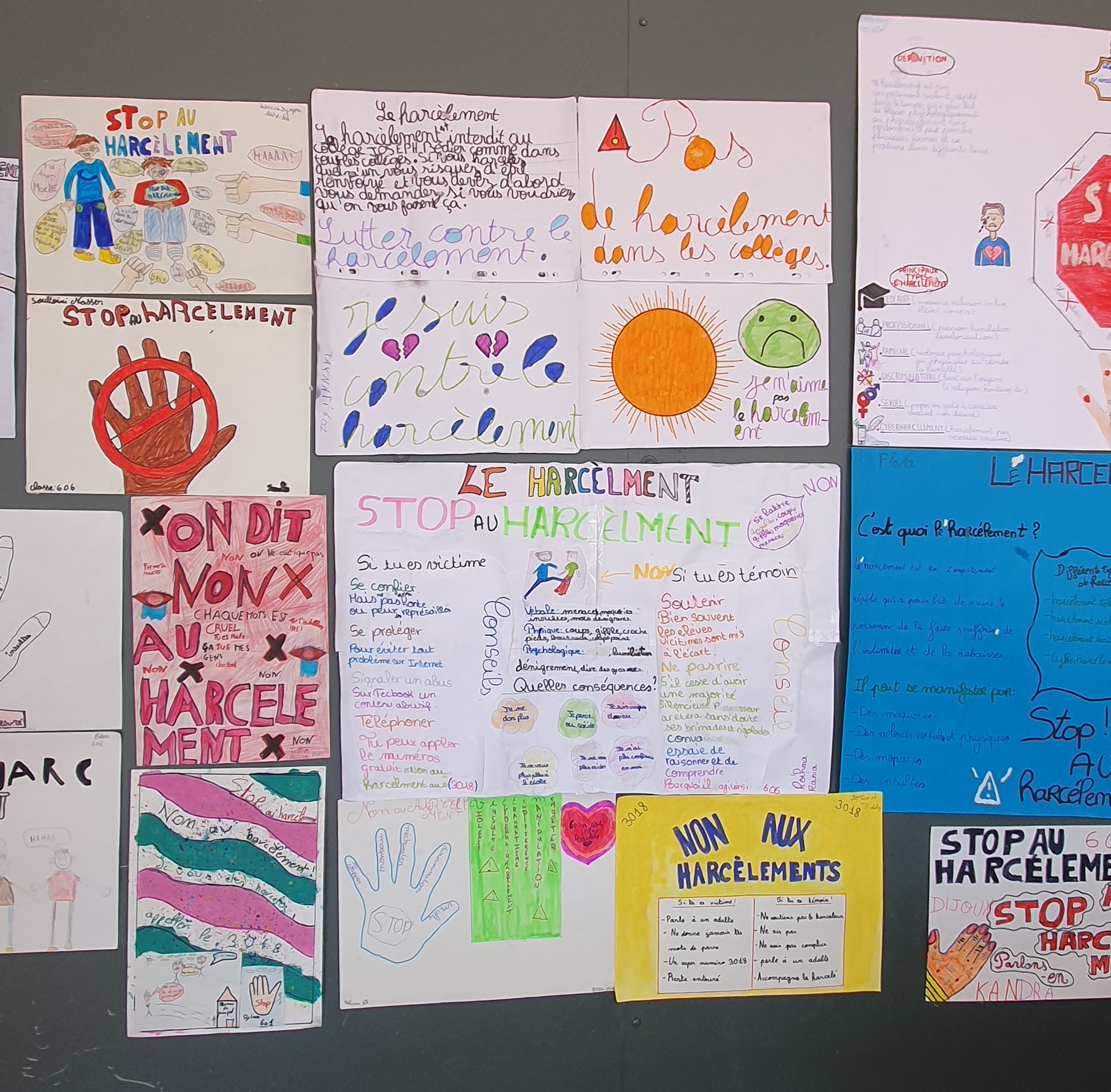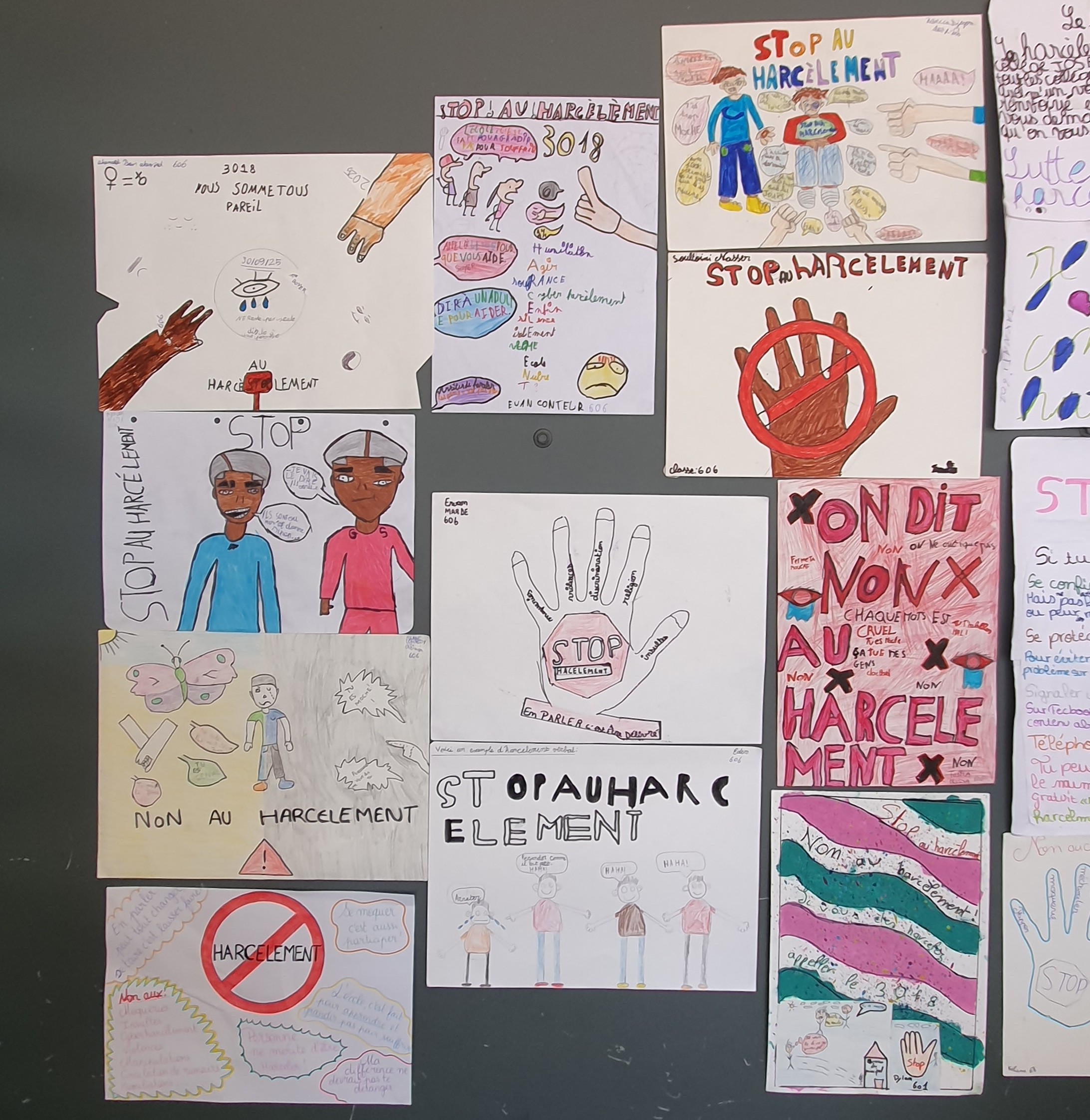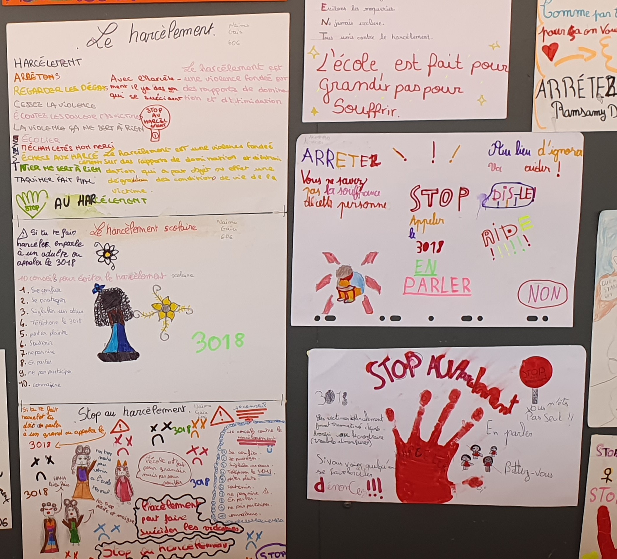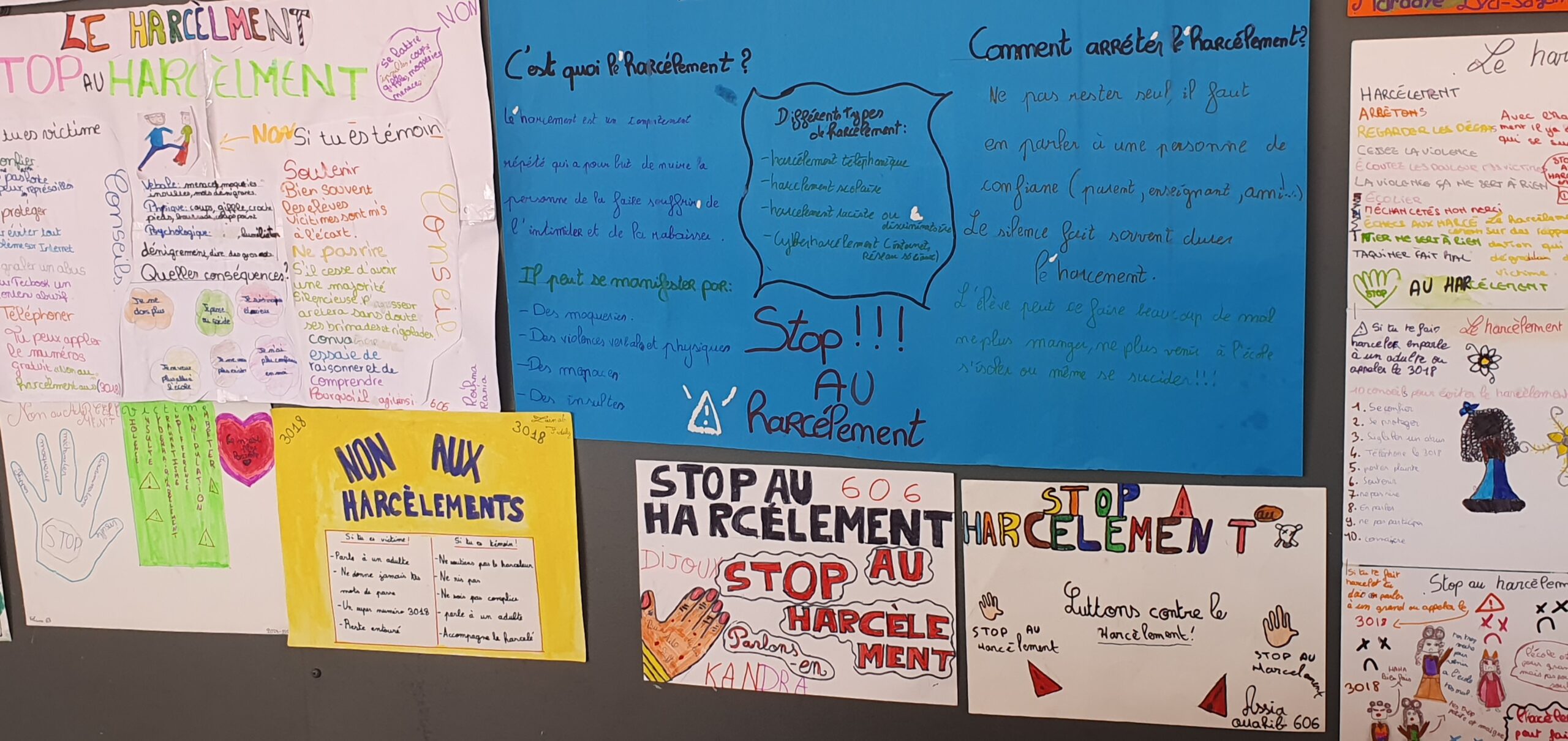– De même, les élèves de 601 et 606 ont réalisé des affiches pour dire « stop au harcèlement ! ». Elles sont exposées à côté du réfectoire.
