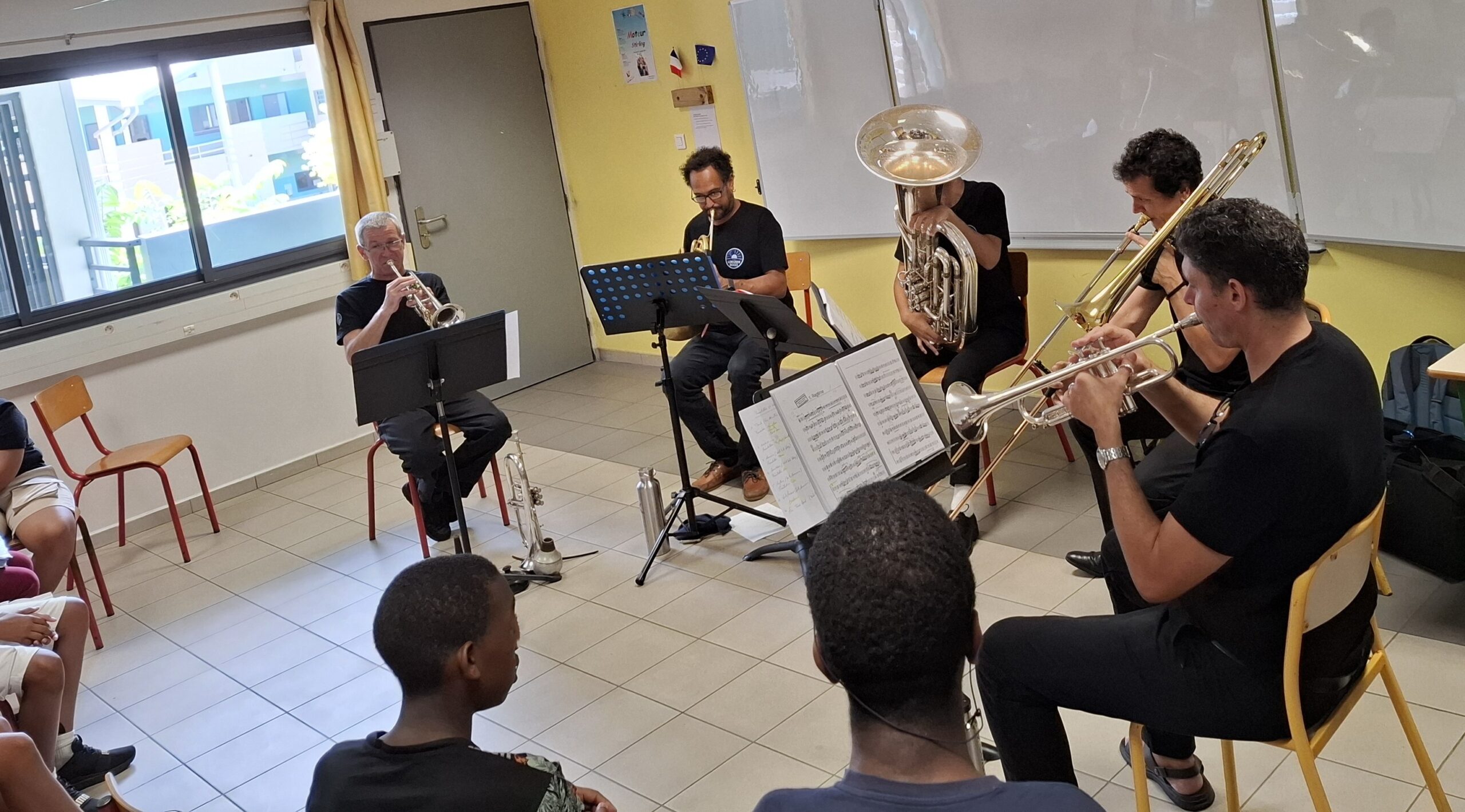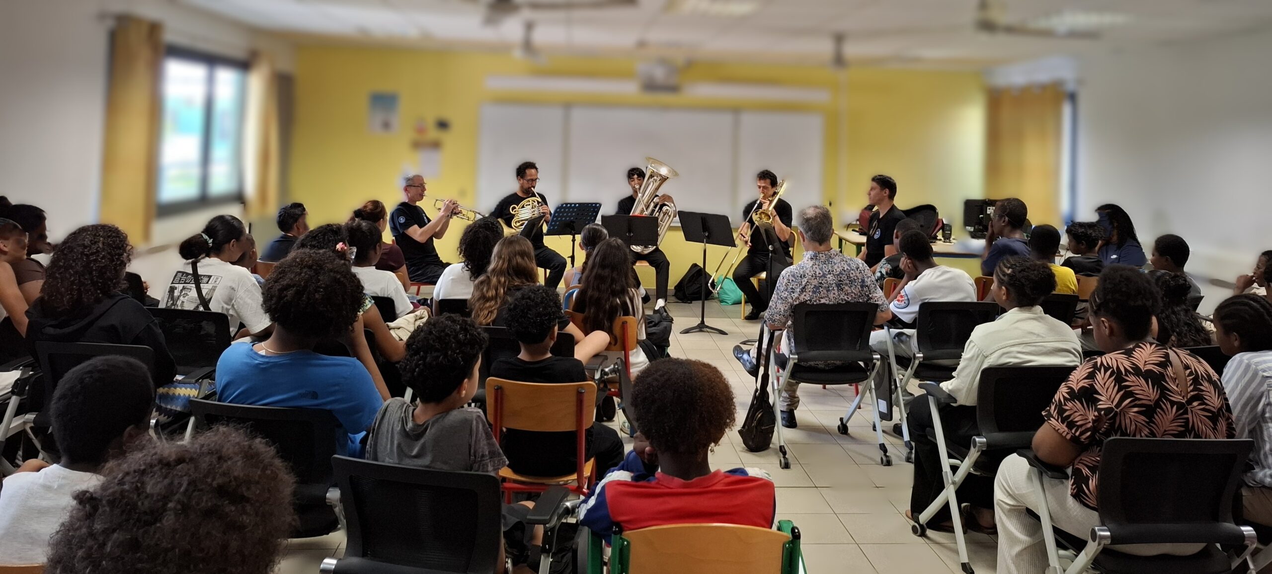 Les Ă©lèves de 5e Saturne, 5e Mercure et les Ă©lèves du dispositif ULIS ont rencontrĂ© mardi 25 novembre les musiciens du quintette Lorizon Brass, pour un voyage musical au pays des cuivres. Trompettes, cor, trombone et tuba ont transportĂ© les collĂ©giens Ă la travers les styles et les Ă©poques avec fantaisie et bonne humeur. Un immense merci aux musiciens qui ont su partager leur passion avec humour, sincĂ©ritĂ© et gĂ©nĂ©rositĂ©.Â