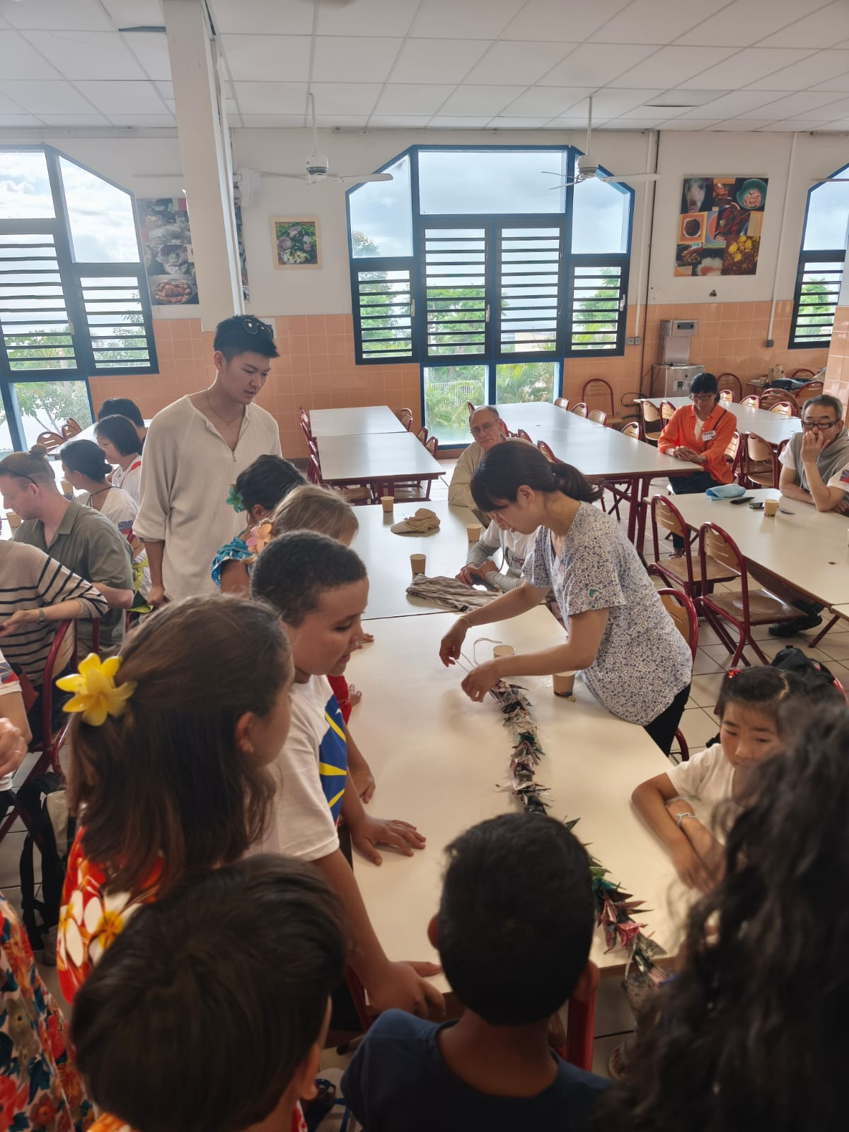 Le 2 mai un groupe de Japonais reçu par le club d’aïkido de Saint Paul a été accueilli par les membres du club Manga et des parents. Un badge avec notre logo leur a été distribué. Des chansons traditionnelles, des danses et des jeux ont ponctué la rencontre. Les échanges ont été difficiles car le japonais c’est compliqué. Nous leur avons appris des mots en créole. Ils ont beaucoup aimé notre cuisine grâce aux différents plats que nous avions préparés. A des dégustations s’est ajoutée la découverte des plantes de la Réunion. Ils sont repartis avec de nombreux cadeaux culinaires. Ils ont été également heureux de terminer avec nous notre guirlande de grues avant qu’elle parte pour Hiroshima. C’était une super rencontre ! Inoubliable !