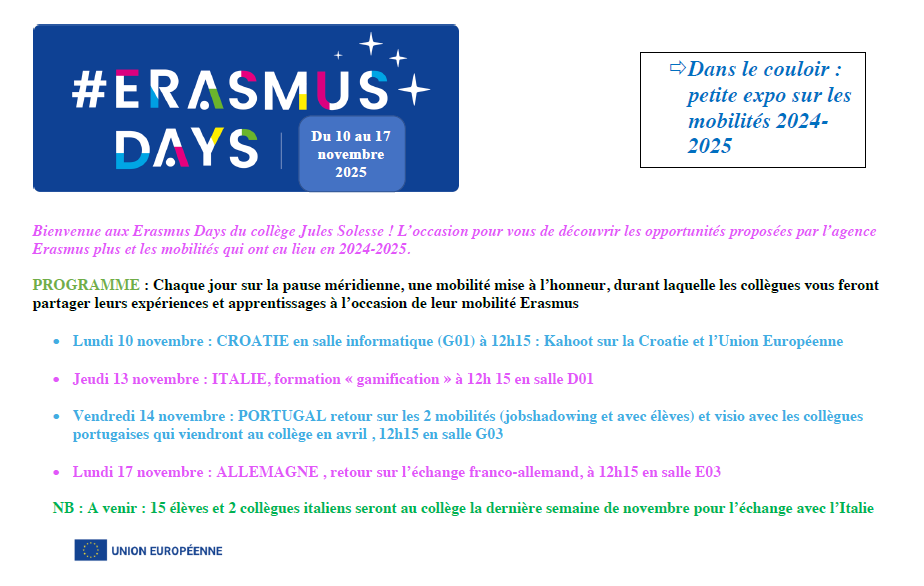 C’est dans le cadre du plan Erasmus 2024-2025 du collège Jules Solesse que les 3eme prépa-métiers ont pu partir en mobilité de groupe au Portugal entre le 25 mai et le 6 juin 2025 (date de retour initialement prévue……le 1er juin !) Accompagnés par madame Artaban leur professeure principale, monsieur Gharsallah,…
