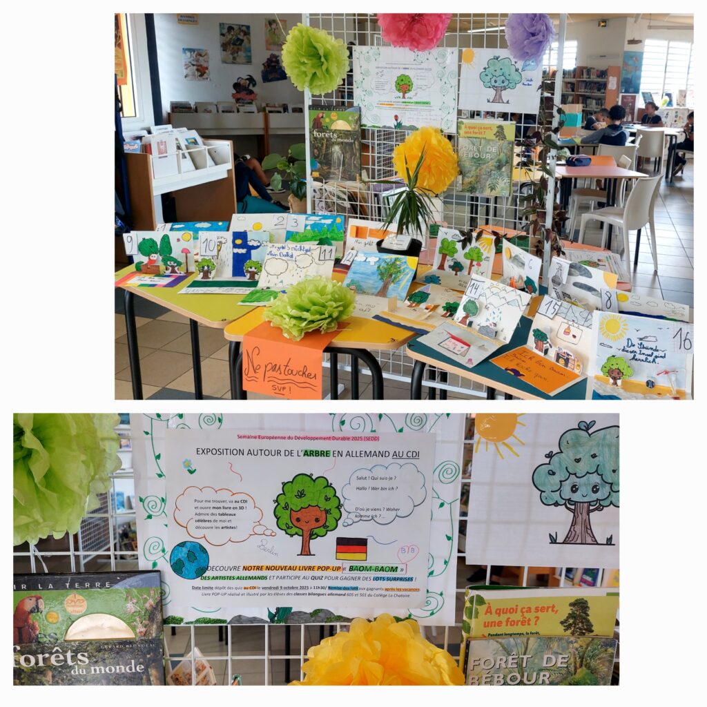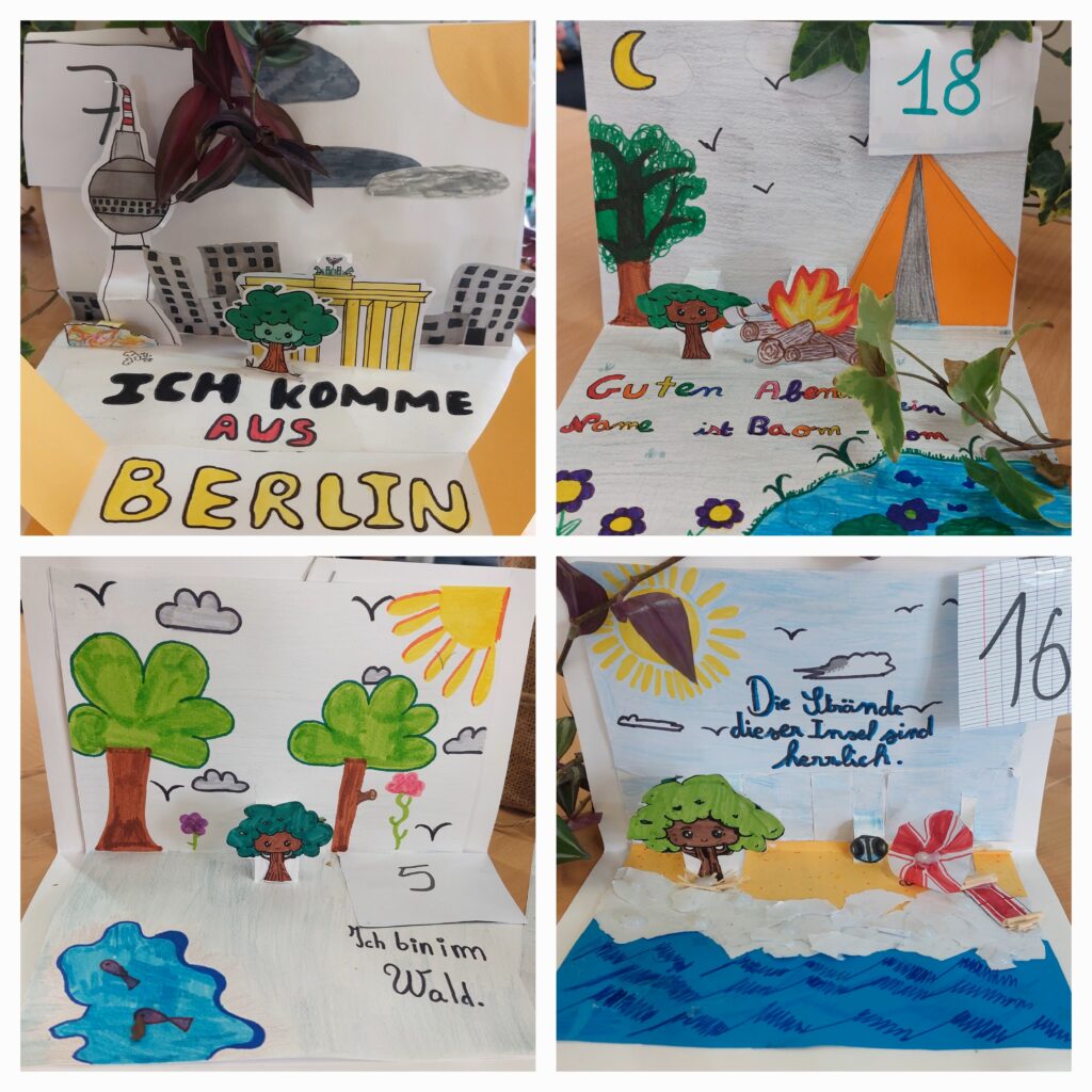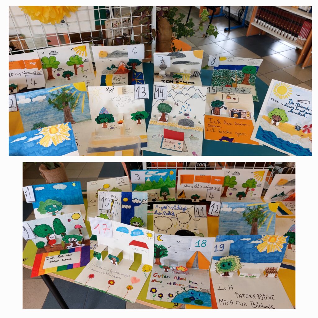 Les élèves de 6ème et 5ème ont réalisé de très belles pages de livre pop-up avec la mascotte de cette exposition, l’arbre Baom-Baom, dans différentes situations et lieux avec une légende en allemand.