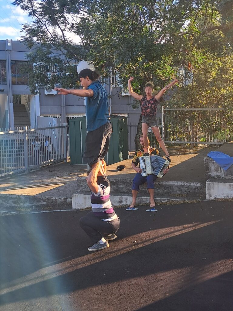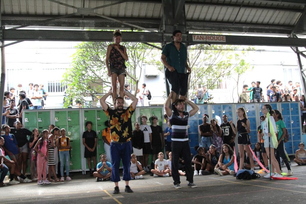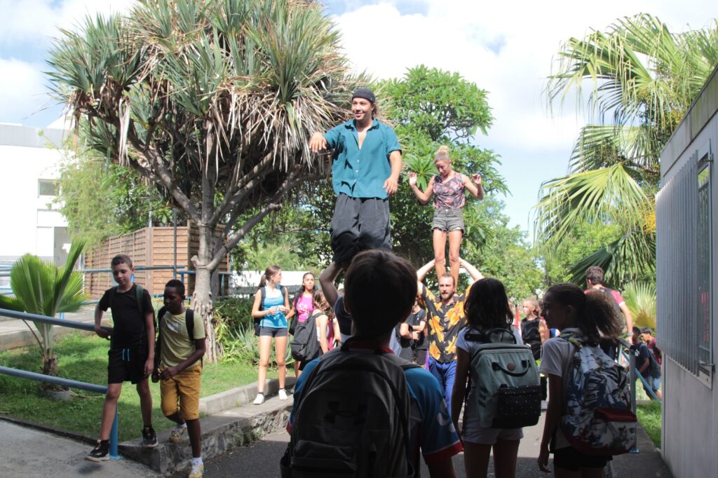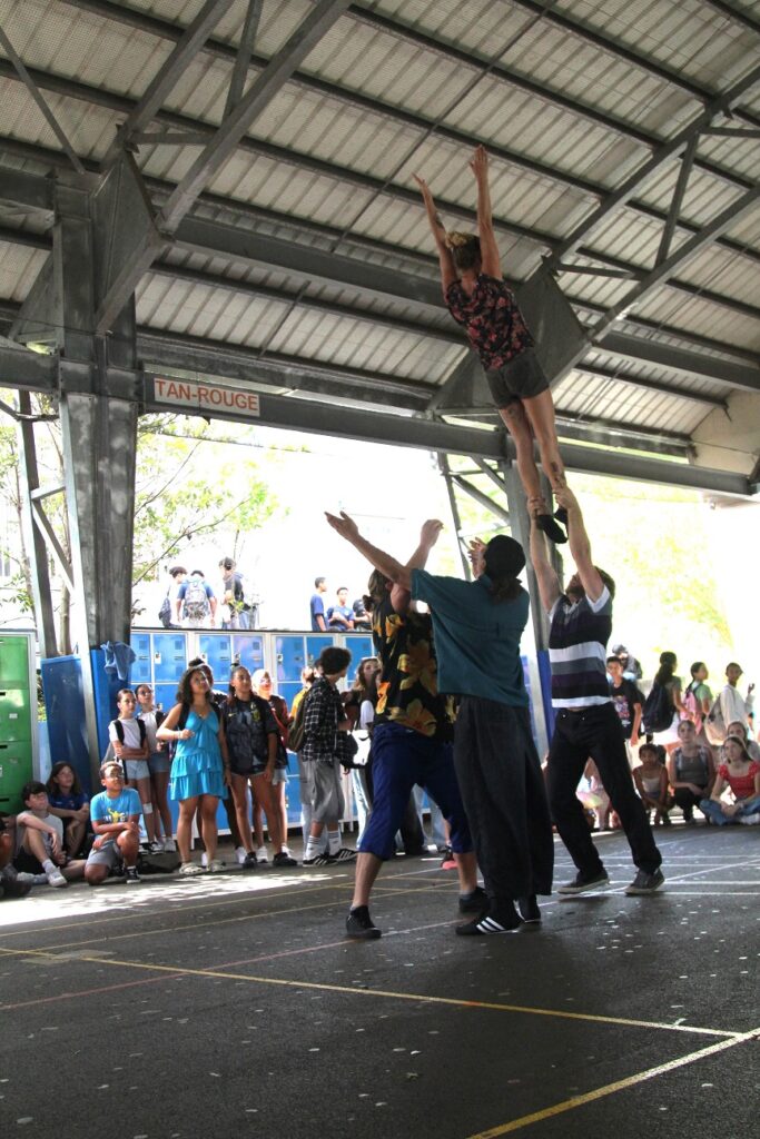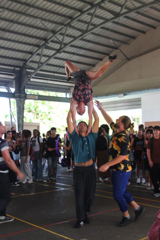 Une belle expérience immersive d’artistes au collège du Bernica. Beaucoup de question de la part des élèves et des yeux pleins d’étoile pour tous les spectateurs. A noter la participation de certains élèves de l’atelier cirque à cet impromptu sous le signe des portés acrobatiques !