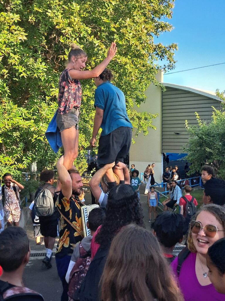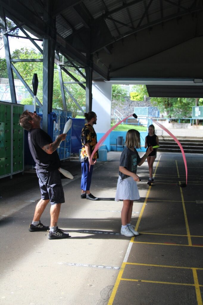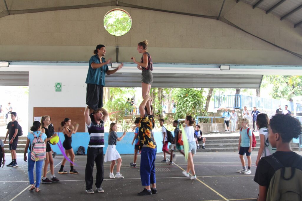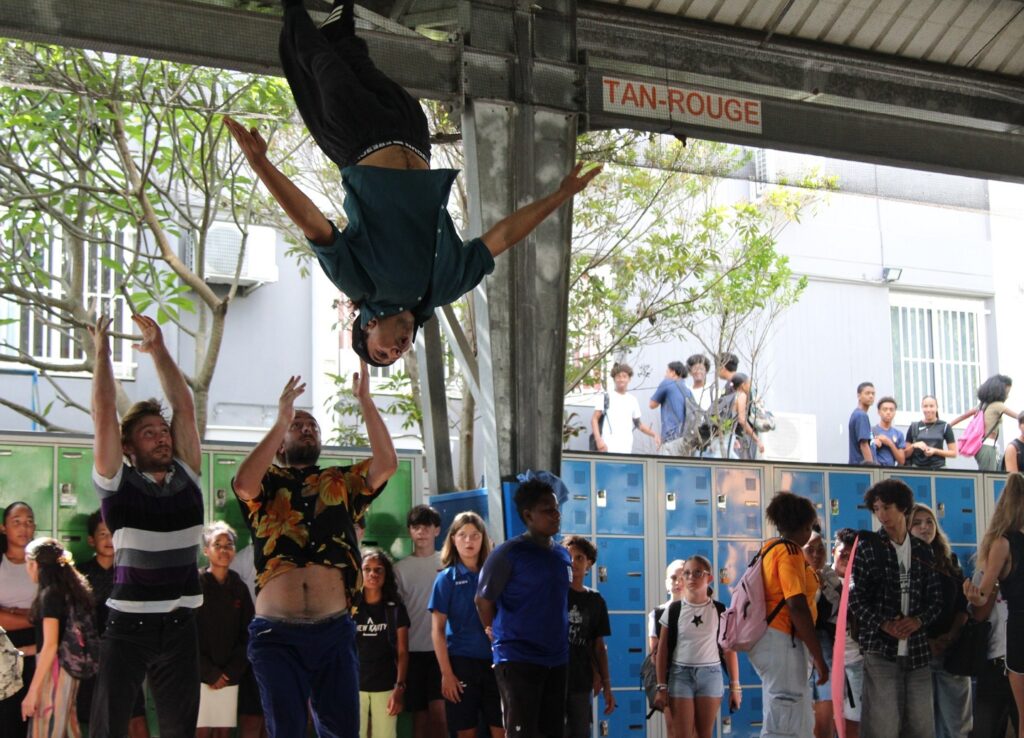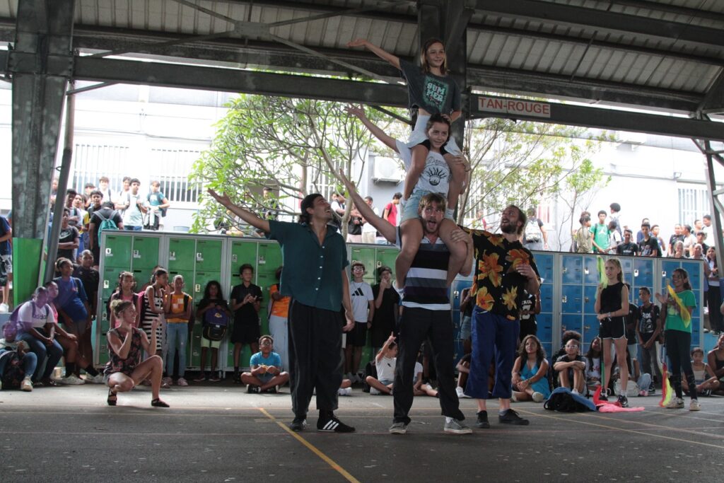 Une belle expérience immersive d’artistes au collège du Bernica. Beaucoup de question de la part des élèves et des yeux pleins d’étoile pour tous les spectateurs. A noter la participation de certains élèves de l’atelier cirque à cet impromptu sous le signe des portés acrobatiques !