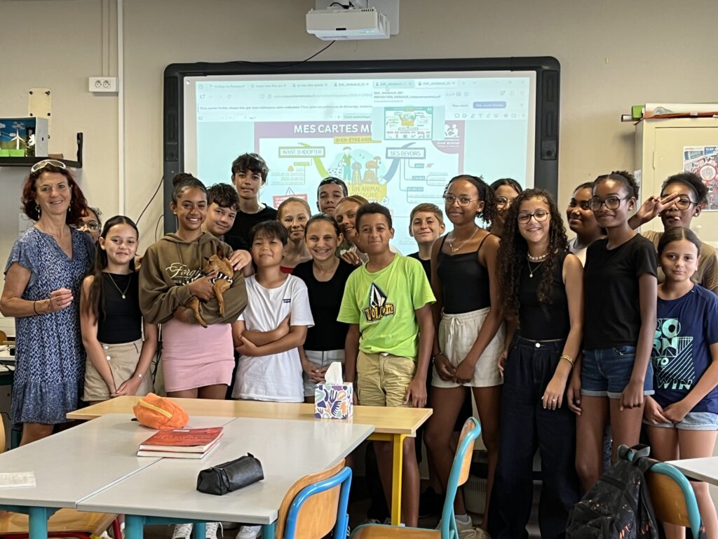 La classe de 5D s’est lancée dans un projet de parrainage d’un chien avec l’association les AILES de la PA. Ils ont rencontré lors d’une première séance Mme Pierre, membre de l’association et professeur au collège. Elle leur a présenté les objectifs de l’association : permettre à des animaux errants ou abandonnés d’être soignés, mis en conformité puis adoptés à la Réunion et en Métropole. Pour ce parrainage, la classe doit trouver des fonds pour financer les soins vétérinaires, l’identification de l’animal, la nourriture et le paiement du voyage en avion pour rejoindre sa nouvelle famille.