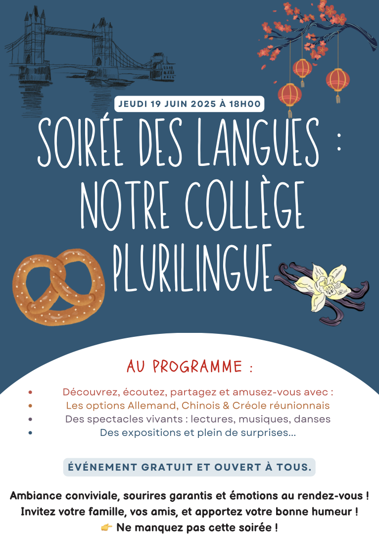 La soirée Collège en fête : le plurilingue, c’est notre langue s’est déroulée le jeudi 19 juin 2025 au collège Les Aigrettes. Ce projet ambitieux a pris forme grâce à l’investissement de nombreux acteurs et a pu voir le jour dans une atmosphère chaleureuse et conviviale.