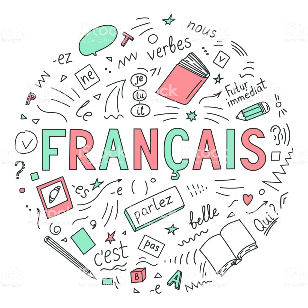 Francais. Translate: « French ». Language education hand drawn doodles and lettering on white background. Vector illustration.
