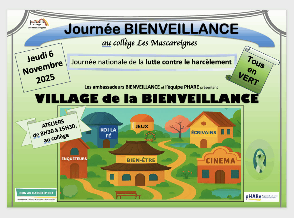 L’équipe PHARE organise une journée BIENVEILLANCE pour marquer l’importance de cette cause au sein de l’établissement de 8h30 à 11h30 et de 12h30 à 15h30, pour les classes (sur le temps scolaire) et pour les élèves (sur le temps de la pause méridienne).