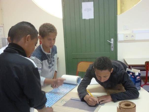 Arnaud fait un tracé sur le plan de la parcelle sous le regard des autres élèves de son groupe.
