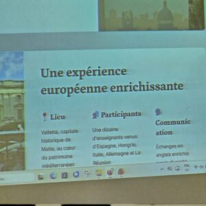 C’est donc le vendredi 4 juillet 2025 (dernier jour d’école) qu’a eu lieu sa restitution, elle a pu nous expliquer comment s’est passée sa formation, quelles compétences elle a pu acquérir pour améliorer la communication dans le domaine de l’administration: améliorer l’accueil et la communication avec les visiteurs ou partenaires européens / gérer les documents ou mails en anglais en autres.