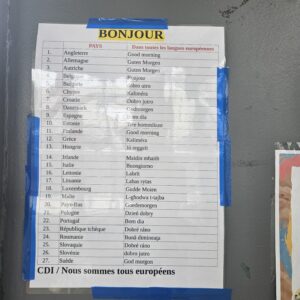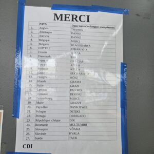 Mme ZAHARY, documentaliste, et les élèves volontaires de 6ème ont réalisé des affiches « Bonjour », « bienvenue » , « au revoir », « merci » dans TOUTES les langues avec la phrase « nous sommes tous européens » au- dessus du panneau.