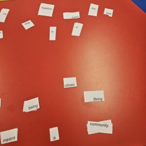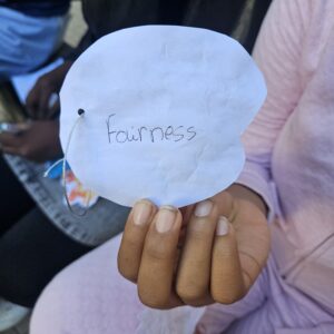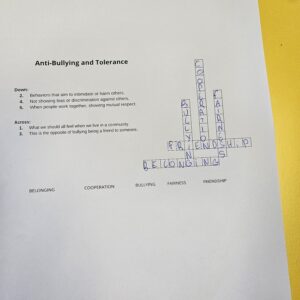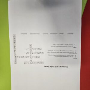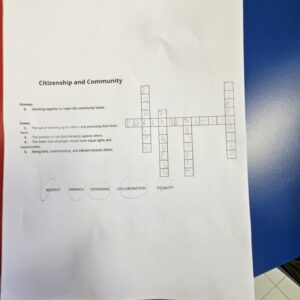 La 2ème activité consistait à compléter des mots croisés contenant des termes civiques tels que tolérance, démocratie, solidarité, respect et intimidation. En groupe, elles ont cherché les bons termes, discuté de leur signification et réfléchi à la façon dont ces concepts s’appliquent à la vie quotidienne.