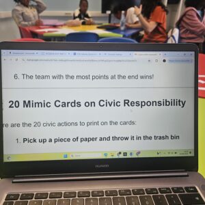 La 4ème activité du jour était basée sur le jeu de rôle et la communication non verbale. Les apprenants ont participé à un jeu de mime, utilisant des phrases liées aux responsabilités et aux comportements positifs. Leurs pairs ont deviné les actions, suivies d’une courte discussion de groupe. Les apprenants ont amélioré leur capacité à exprimer et à interpréter des messages sans mots, en développant l’empathie. Ils ont renforcé leur compréhension de la responsabilité dans la vie civique.