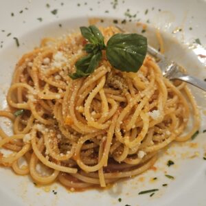 Des dernières spécialités italiennes: pâte à la bolognaise et le dessert Seadas (spécialité de la Sardaigne)